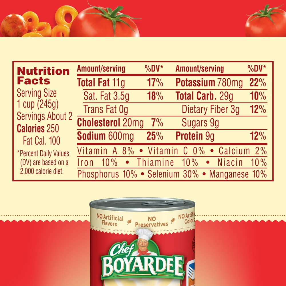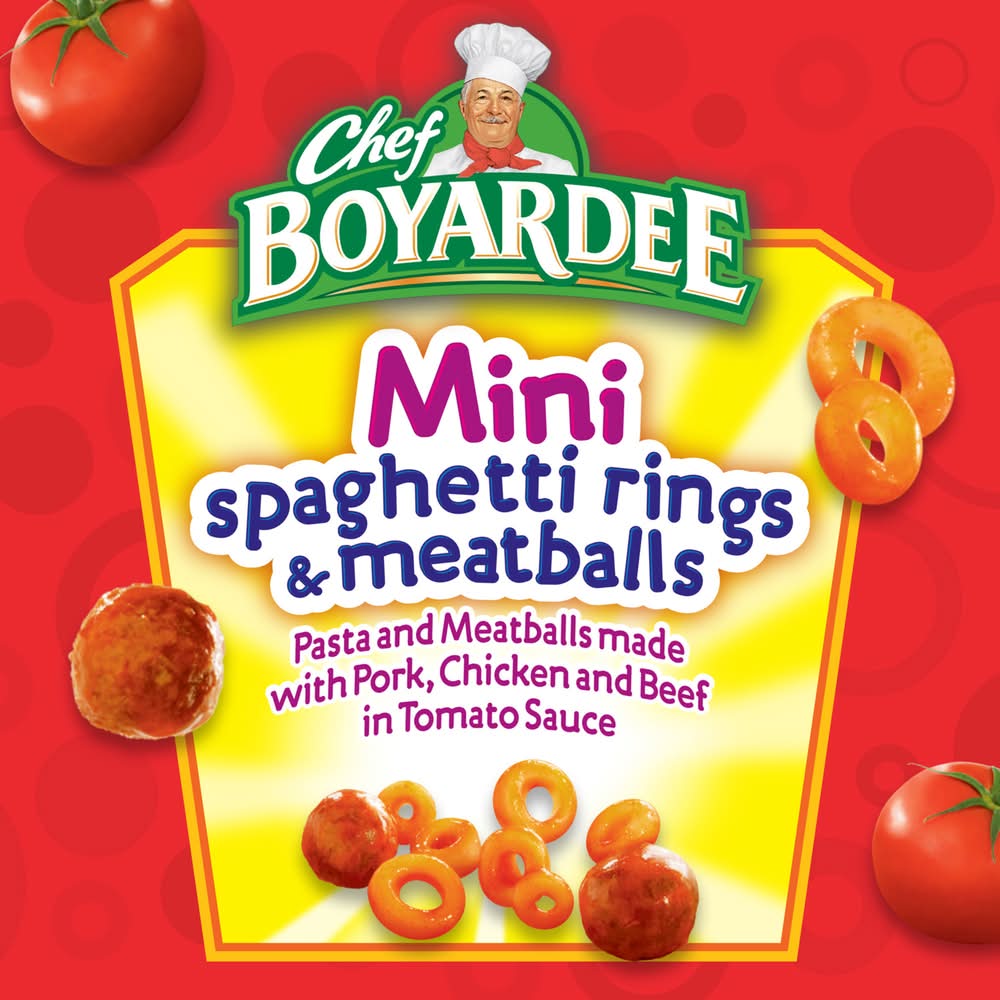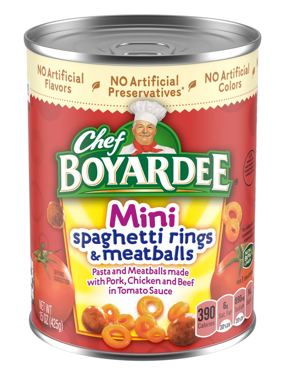 Delicious and convenient, Chef Boyardee Mini Spaghetti Rings and Meatballs is ready to eat in minutes, and has the taste you'll love. Enriched pasta in a hearty tomato sauce and tasty mini meatballs made from beef, chicken, and pork give Chef Boyardee Mini Spaghetti Rings and Meatballs the timeless flavor that everyone loves. Ready to serve in just 90 seconds, Chef Boyardee Mini Spaghetti Rings and Meatballs is the heat-and-eat meal busy families can count on. Simple and easy to make, anyone can grab Chef Boyardee Mini Spaghetti Rings and Meatballs off the shelf when they need a quick snack. Chef Boyardee Mini Spaghetti Rings and Meatballs contains 2 servings of pasta and tomato sauce in each 15 oz easy-open can, with 13 grams of protein and 390 calories per serving. With no artificial flavors, colors, or preservatives, Chef Boyardee makes a wholesome meal for kids of ALL ages. • Conagra Brands, PO Box 3534,Chicago,IL,60654 • Packaging: Reusable