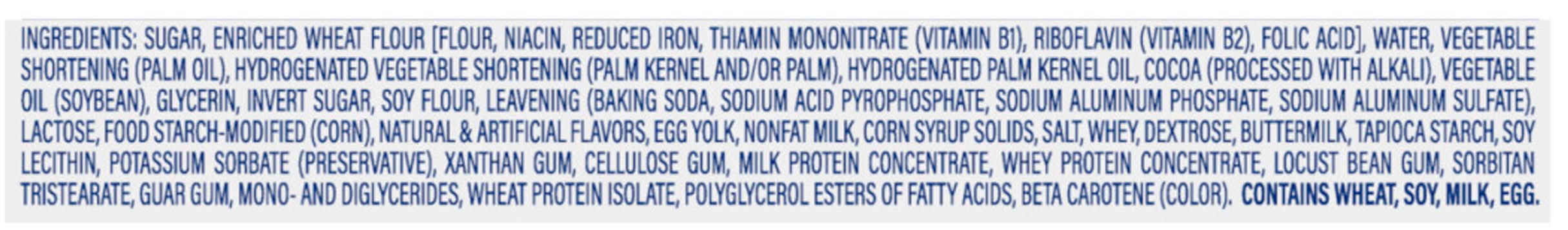 Ingredients: Sugar, Enriched Wheat Flour [Flour, Niacin, Reduced Iron, Thiamin Mononitrate (Vitamin B1), Riboflavin (Vitamin B2), Folic Acid], Water, Vegetable Shortening (Palm Oil), Hydrogenated Vegetable Shortening (Palm Kernel and/or Palm), Hydrogenated Palm Kernel Oil, Cocoa (Processed with Alkali), Vegetable Oil (Soybean), Glycerin, Invert Sugar, Soy Flour, Leavening (Baking Soda, Sodium Acid Pyrophosphate, Sodium Aluminum Phosphate, Sodium Aluminum Sulfate), Lactose, Food Starch-Modified (Corn), Natural & Artificial Flavors, Egg Yolk, Nonfat Milk, Corn Syrup Solids, Salt, Whey, Dextrose, Buttermilk, Tapioca Starch, Soy Lecithin, Potassium Sorbate (Preservative), Xanthan Gum, Cellulose Gum, Milk Protein Concentrate, Whey Protein Concentrate, Locust Bean Gum, Sorbitan Tristearate, Guar Gum, Mono- and Diglycerides, Wheat Protein Isolate, Polyglycerol Esters of Fatty Acids, Beta Carotene (Color). Contains: Wheat, Soybeans, Milk, Eggs, Lactose, Corn