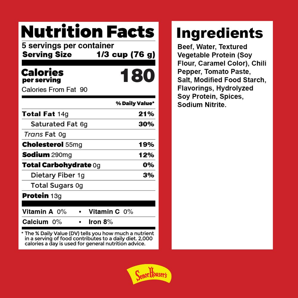 Ingredients: Beef, Water, Textured Vegetable Protein (Soy Flour, Caramel Color), Chili Pepper, Tomato Paste, Salt, Modified Food Starch, Flavorings, Hydrolyzed Soy Protein, Spices, Sodium Nitrite