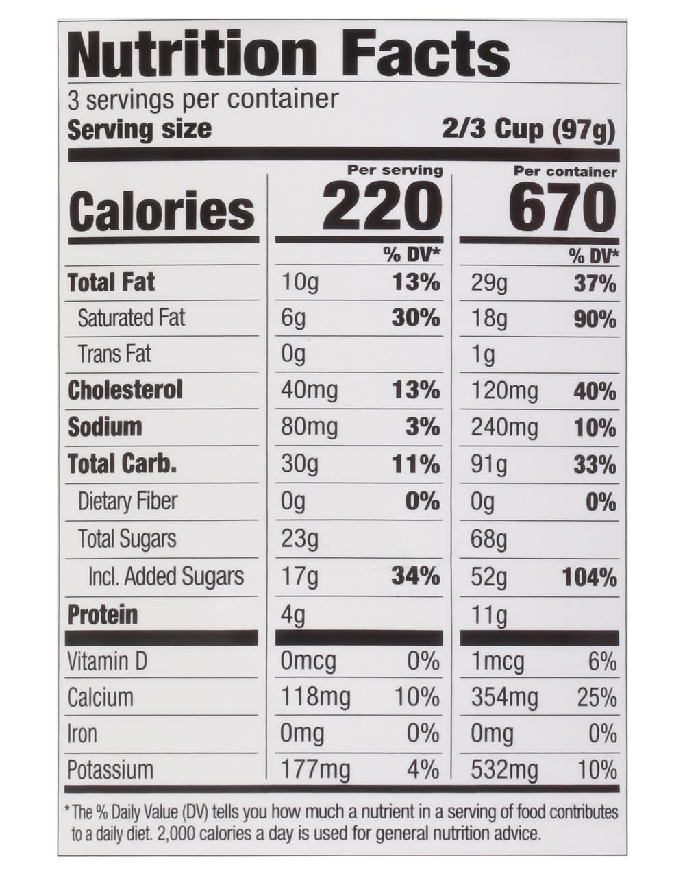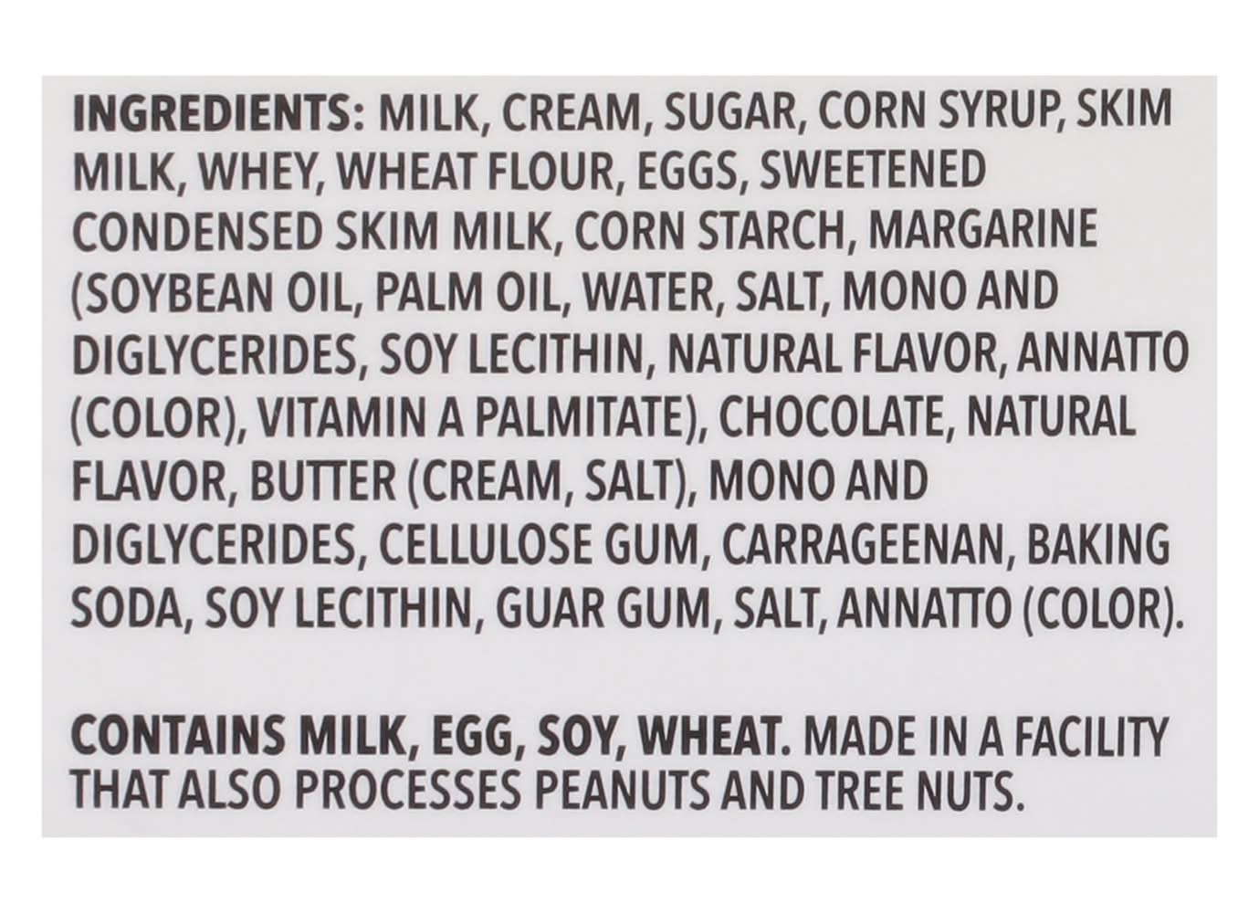 Ingredients: Milk Cream Sugar Corn Syrup Skim Milk Whey Wheat Flour Eggs Sweetened Condensed Skim Milk Corn Starch, Margarine (Soybean Oil, Palm Oil, Water, Salt, Mono and Diglycerides, Soy Lecithin, Natural Flavor, Annatto (Color) Vitamin A Palmitate) Chocolate Natural Flavor, Butter (Cream, Salt) Mono and Diglycerides Cellulose Gum Carrageenan Baking Soda Soy Lecithin Guar Gum Salt Annatto (Color). Contains: Milk Eggs Soybeans Wheat Corn Peanuts Tree Nuts