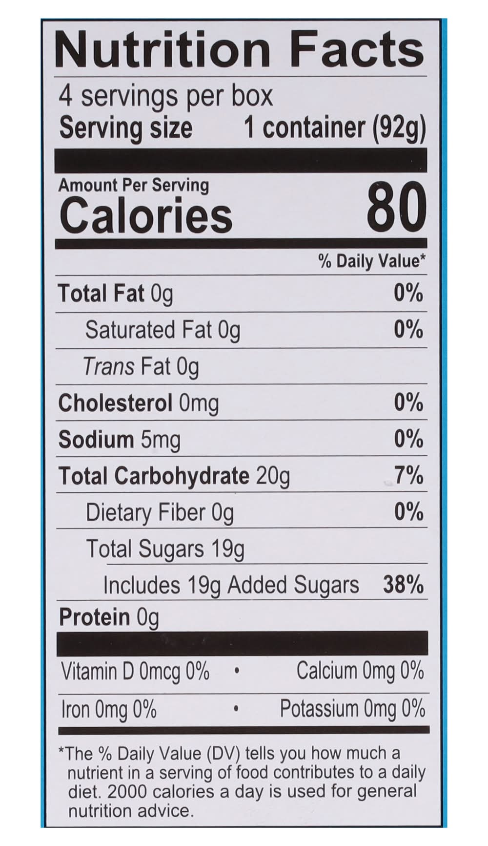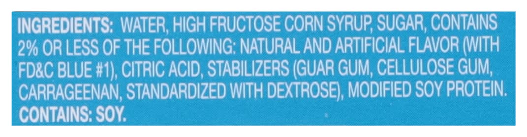 Ingredients: Water, High Fructose Corn Syrup, Sugar, Contains 2% or Less of the Following: Natural and Artificial Flavor (with FD&C Blue 1), Citric Acid, Stabilizers (Guar Gum, Cellulose Gum, Carrageenan, Standardized with Dextrose), Modified Soy Protein Contains: Soybeans, Corn