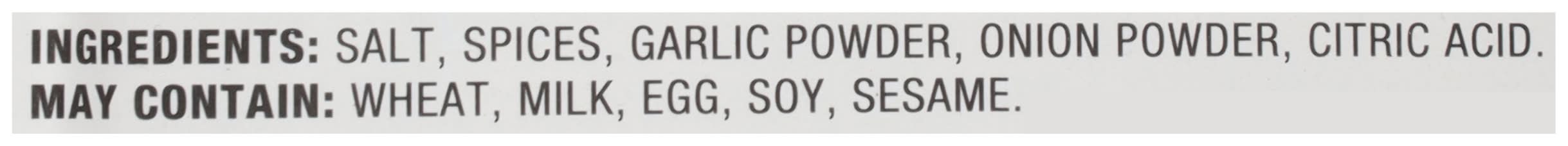 Ingredients: Salt, Spices, Garlic Powder, Onion Powder, Citric Acid Contains: Wheat, Milk, Eggs, Soybeans, Sesame