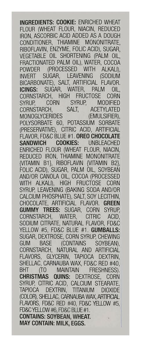 Ingredients: Cookie: Enriched Wheat Flour (Wheat Flour, Niacin, Reduced Iron, Ascorbic Acid Added as a Dough Conditioner, Thiamine Mononitrate, Riboflavin, Enzyme, Folic Acid), Sugar, Vegetable Oil Shortening (Palm Oil, Fractionated Palm Oil), Water, Cocoa Powder (Processed with Alkali), Invert Sugar, Leavening (Sodium Bicarbonate), Salt, Artificial Flavor. Icings: Sugar, Water, Palm Oil, Cornstarch, High Fructose Corn Syrup, Corn Syrup, Modified Cornstarch, Salt, Acetylated Monoglycerides (Emulsifier), Polysorbate 60, Potassium Sorbate (Preservative), Citric Acid, Artificial Flavor, FD&C Blue #1. Oreo Chocolate Sandwich Cookies: Unbleached Enriched Flour (Wheat Flour, Niacin, Reduced Iron, Thiamine Mononitrate {Vitamin B1), Riboflavin (Vitamin B2}, Folic Acid), Sugar, Palm Oil, Soybean and/or Canola Oil, Cocoa (Processed with Alkali), High Fructose Corn Syrup, Leavening (Baking Soda and/or Calcium Phosphate), Salt, Soy Lecithin, Chocolate, Artificial Flavor. Green Gummy Trees: Sugar, Corn Syrup, Cornstarch, Water, Citric Acid, Sodium Citrate, Natural Flavor, FD&C Yellow #5, FD&C Blue #1, Gumballs: Sugar, Dextrose, Corn Syrup, Chewing Gum Base (Contains Soybean), Cornstarch, Natural and Artificial Flavors, Glycerin, Tapioca Dextrin, Shellac, Carnauba Wax, FD&C Red #40, BHT (to Maintain Freshness). Christmas Quins: Dextrose, Corn Syrup, Citric Acid, Calcium Stearate, Tapioca Dextrin, Titanium Dioxide (Color), Shellac, Carnauba Wax, Artificial Flavors, FD&C Red #40, FD&C Yellow #5, FD&C Yellow #6, FD&C Blue #1 Contains: Soybeans, Wheat, Milk, Eggs