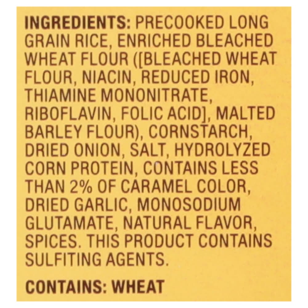 Ingredients: Precooked Long Grain Rice, Enriched Bleached Wheat Flour ([Bleached Wheat Flour, Niacin, Reduced Iron, Thiamine Mononitrate, Riboflavin, Folic Acid], Malted Barley Flour), Cornstarch, Dried Onion, Salt, Hydrolyzed Corn Protein, Contains Less than 2% of Caramel Color, Dried Garlic, Monosodium Glutamate, Natural Flavor, Spices, This Product Contains Sulfiting Agents Contains: Wheat, Barley