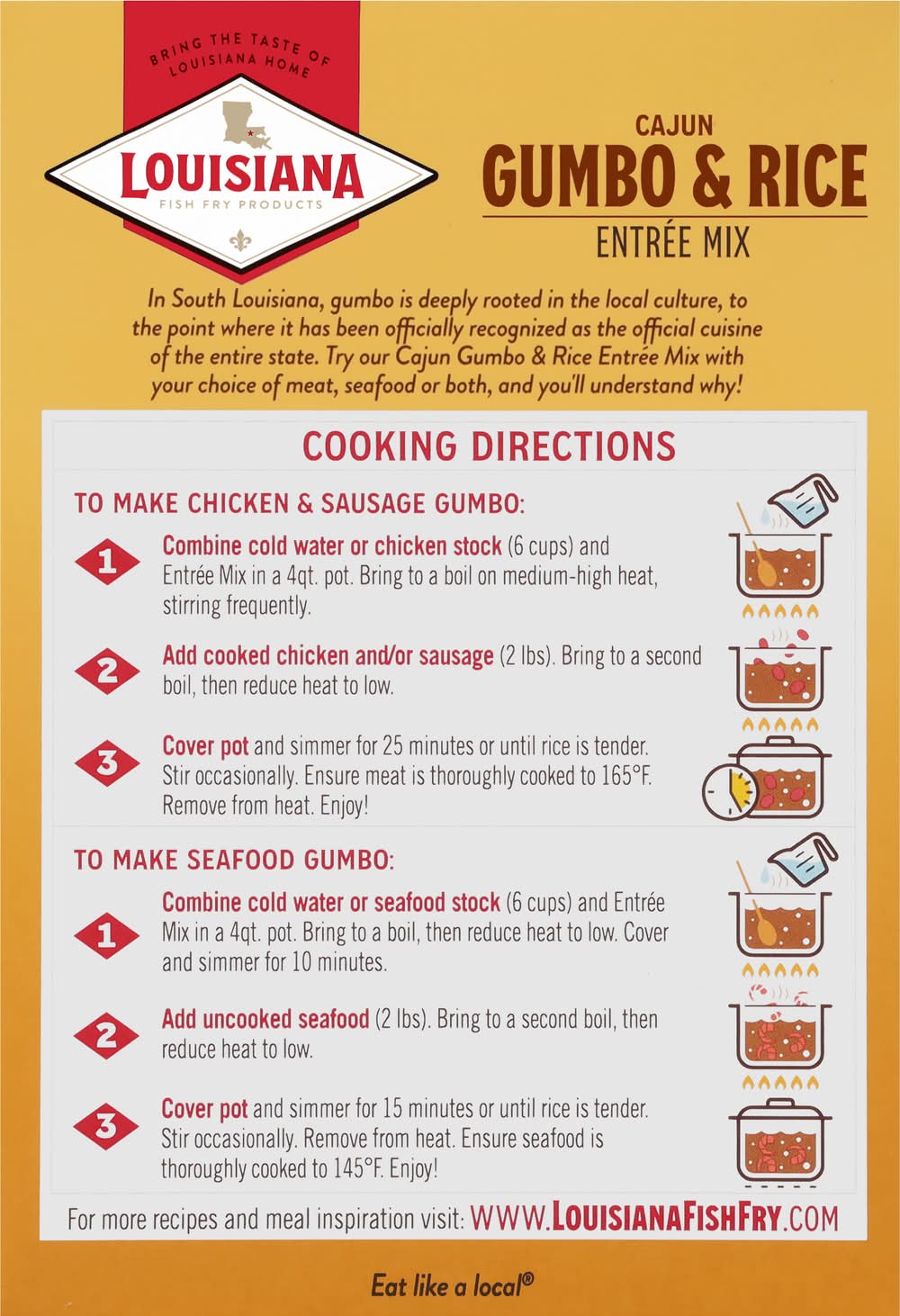 Cooking directions: 3 easy steps. for chicken & sausage gumbo: 1. in 4 qt. pot, combine 6 cups of cold water or chicken stock and la fish fry gumbo & rice entree mix. stir often while bringing to a boil. 2. add 2 lbs. of thoroughly cooked (to 165 degrees f) chicken and /or sausage. 3. bring to a second boil. reduce heat to low, u cover, and simmer for 25 minutes, or until rice is tender. stir occasionally. remove from heat. enjoy! for seafood gumbo: follow step 1 above. substitute 2 lbs. of uncooked seafood for the chicken/sausage in step 2. bring to a second boil. reduce heat to low, cover, and simmer for 25 minutes, or until rice is tender. stir occasionally. remove from heat (add oysters at this time, if desired). ensure seafood is thoroughly cooked to an internal temperature of 145 degrees f. enjoy! add meat or seafood for a complete meal.