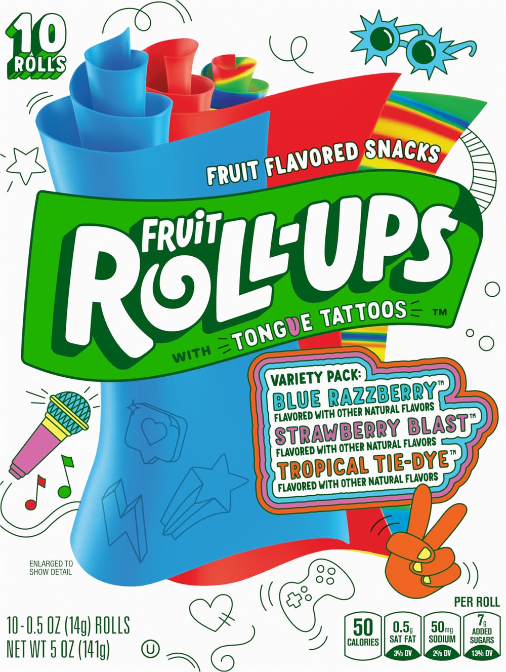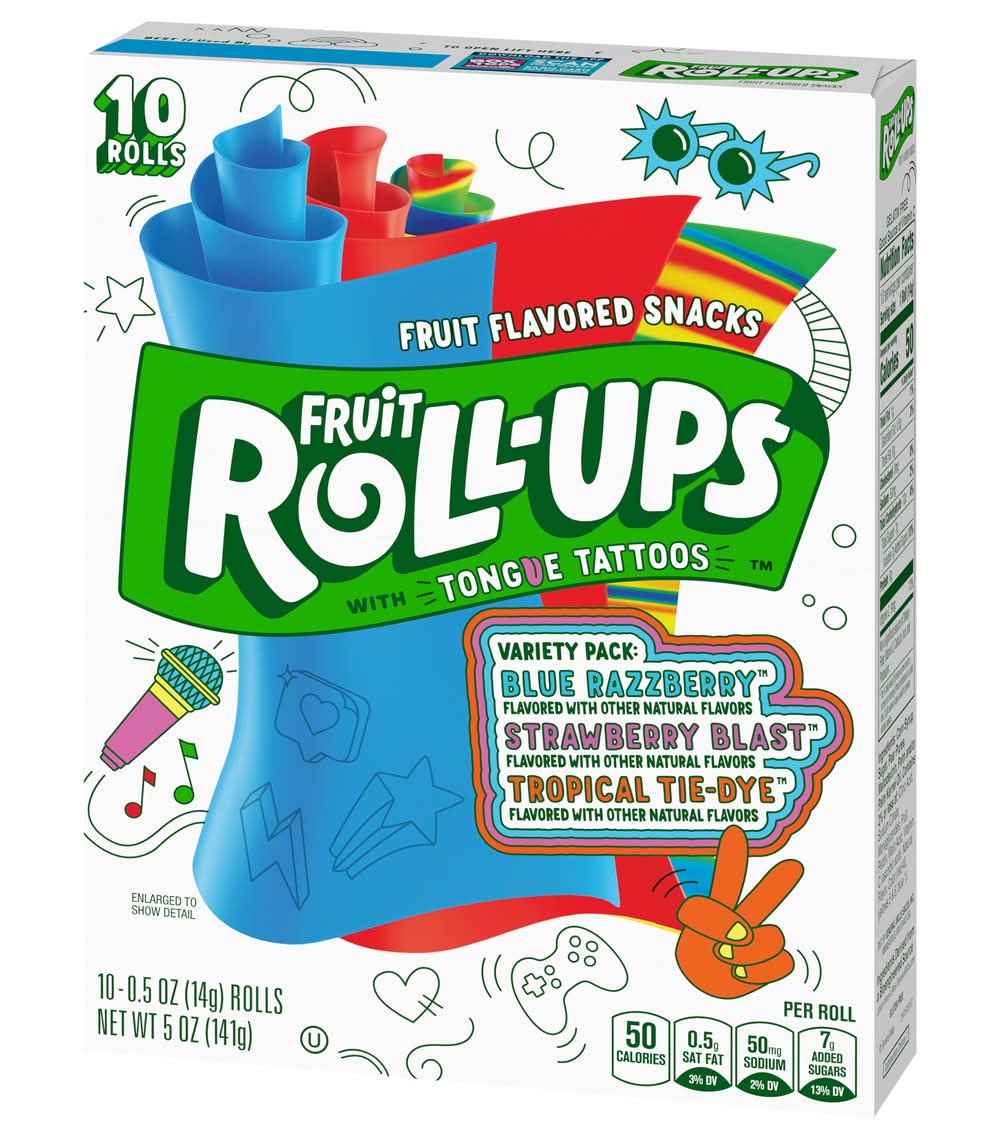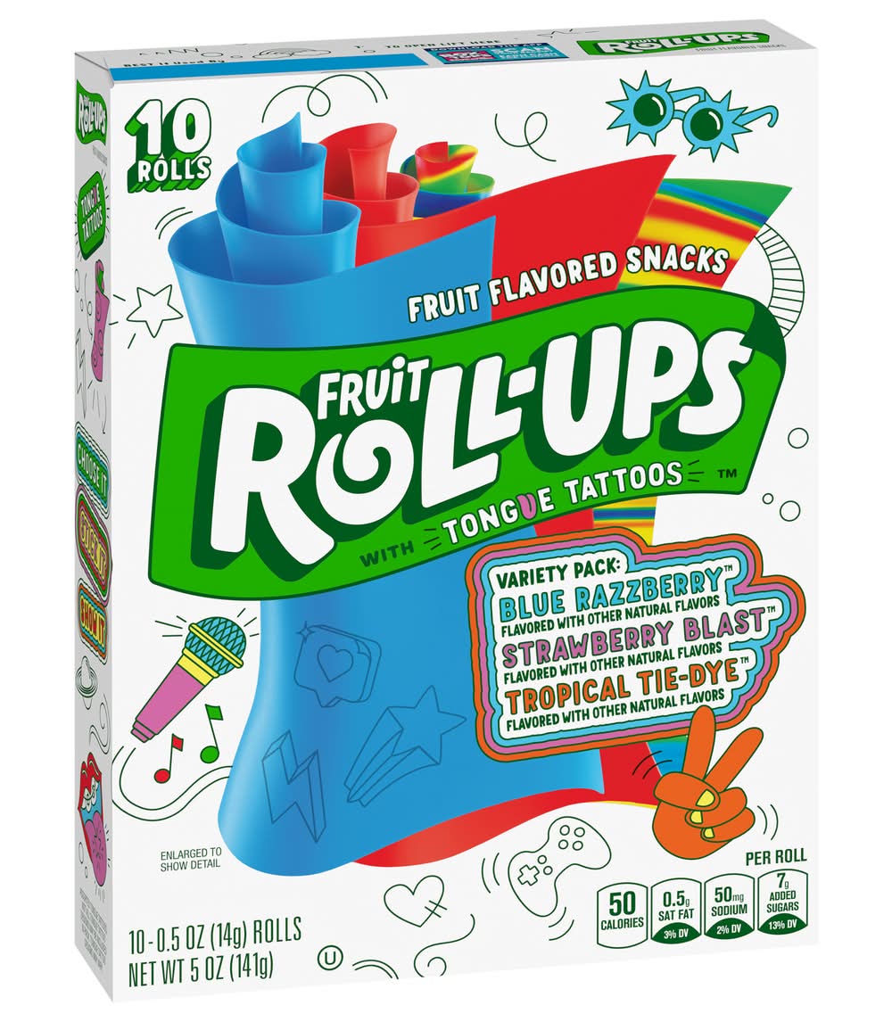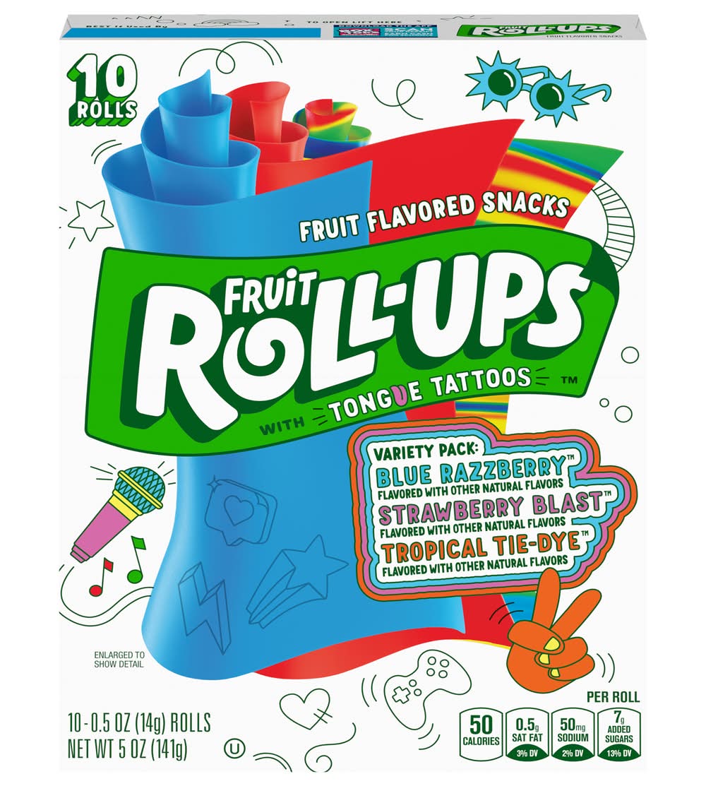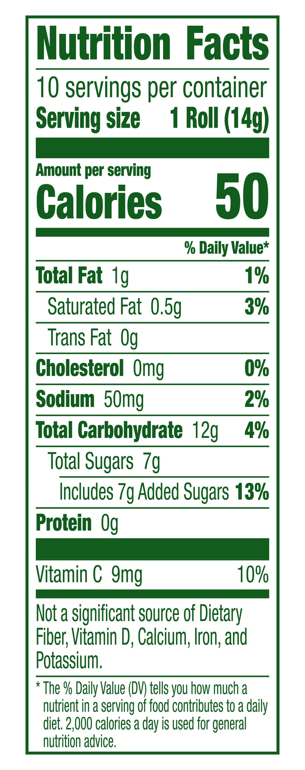 Tropical Tie-Dye. Strawberry. Cherry Orange Wildfire. Naturally flavored. Good source of vitamin C. 50 calories per roll. Gluten free. Made with real fruit. Carbohydrate Choices: 1. Flavor: