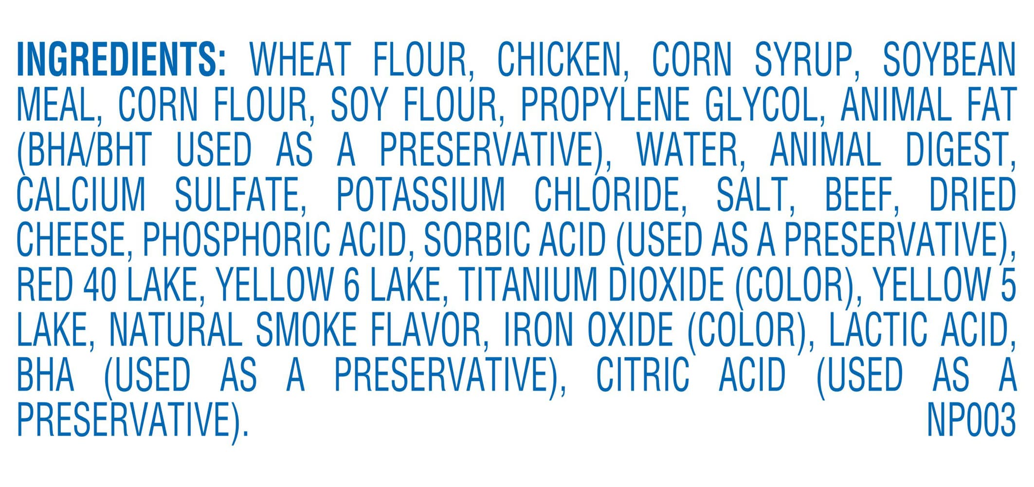 Ingredients: Chicken, Soy Flour, Corn Syrup, Wheat Flour, Corn Starch, Propylene Glycol, Calcium Sulfate, Water, Animal Fat (BHA Used as a Preservative), Anima Digest, Potassium Chloride, Salt, Beef, Dried Cheese Product, Phosphoric Acid, Sorbic Acid (Used as a Preservative), Red 40 Lake, Yellow 6 Lake, Titanium Dioxide (Color), Garlic Powder, Yellow 5 Lake, Iron Oxide (Color), Lactic Acid, BHA (Used as a Preservative), Citric Acid (Used as a Preservative), Natural Smoke Flavor. NP04