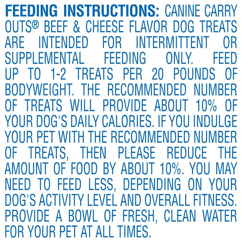 Directions: tear to open zip to close. feeding instructions: feed as a snack or treat, as part of a healthy diet. break into small pieces for small dogs. always monitor your pet while treating. fresh drinking water should always be available.