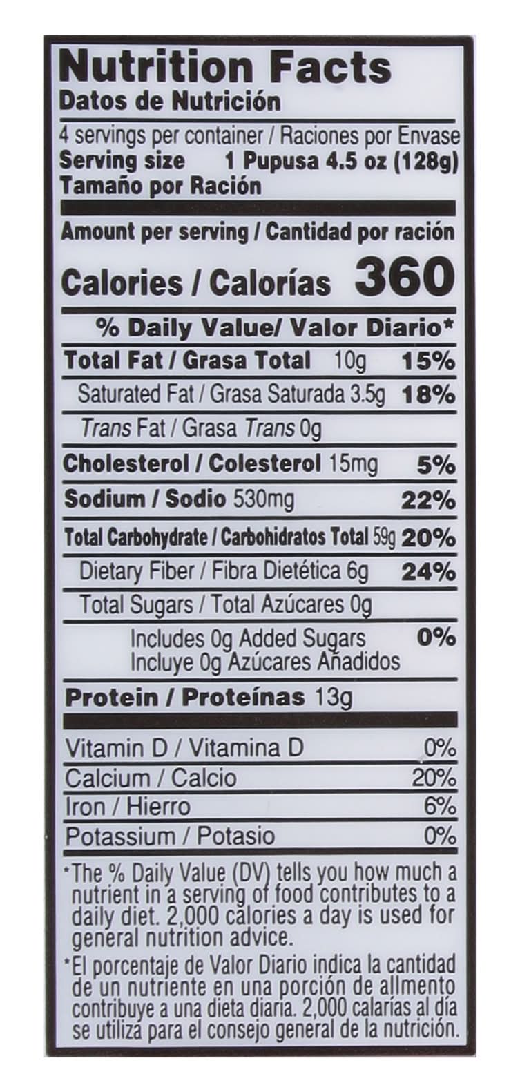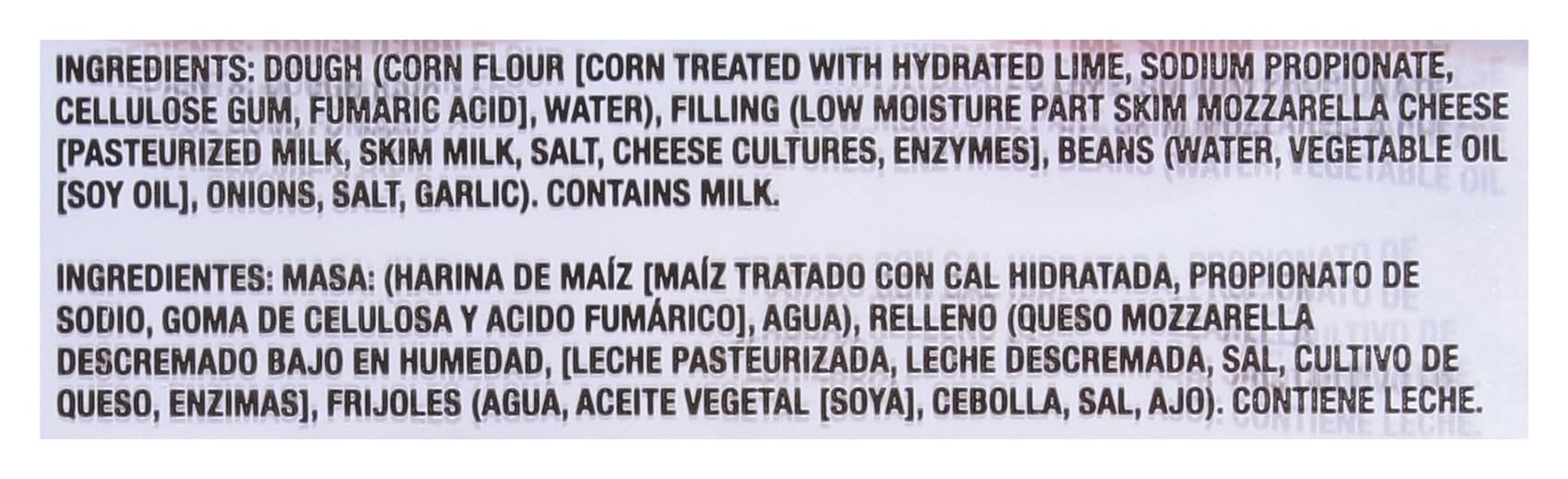 Ingredients: Dough (Corn Flour [Corn Treated with Hydrated Lime, Sodium Propionate, Cellulose Gum, Fumaric Acid], Water), Filling (Low Moisture Part Skim Mozzarella Cheese [Pasteurized Milk, Skim Milk, Salt, Cheese Cultures, Enzymes], Beans (Water, Vegetable Oil [Soy Oil], Onions, Salt, Garlic)