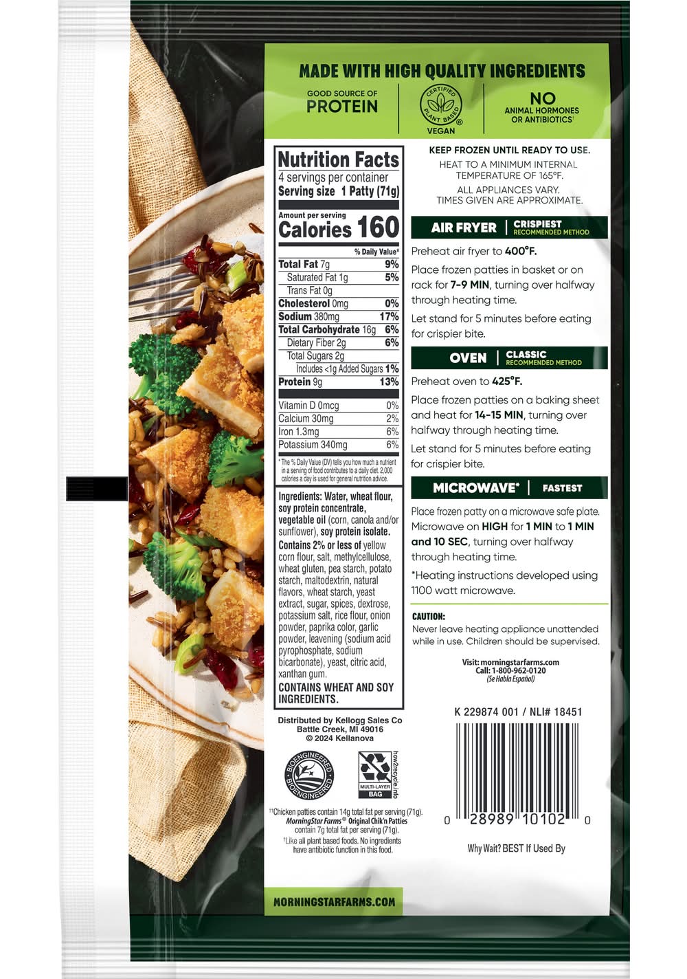 MorningStar Farms Original chik'n patties feature a lightly seasoned patty with a crispy, crunchy breading outside and tender inside. Ideal for an array of recipes, these vegan patties can become part of a satisfying sandwich, wrap, or even a delicious pasta dish. With 50% less fat than regular chicken patties*, these patties provide a good source of protein (12% of daily value); Stock this convenient resealable bag in the freezer for an exciting anytime meal starter you can easily prepare in an oven or microwave. Whether you're putting together a winning spread for game night, preparing a meal to share with the whole family, or just seeking a quick and convenient lunch or dinner starter, MorningStar Farms Original chik'n patties are a delicious choice sure to please meat-lovers and vegetarians alike. *Chicken patties contain 14g total fat per serving (71g). MorningStar Farms Chik Patties Original contain 7g total fat per serving (71g). • Kellogg Sales Co., Battle Creek, MI, 49016 • Packaging: Reusable