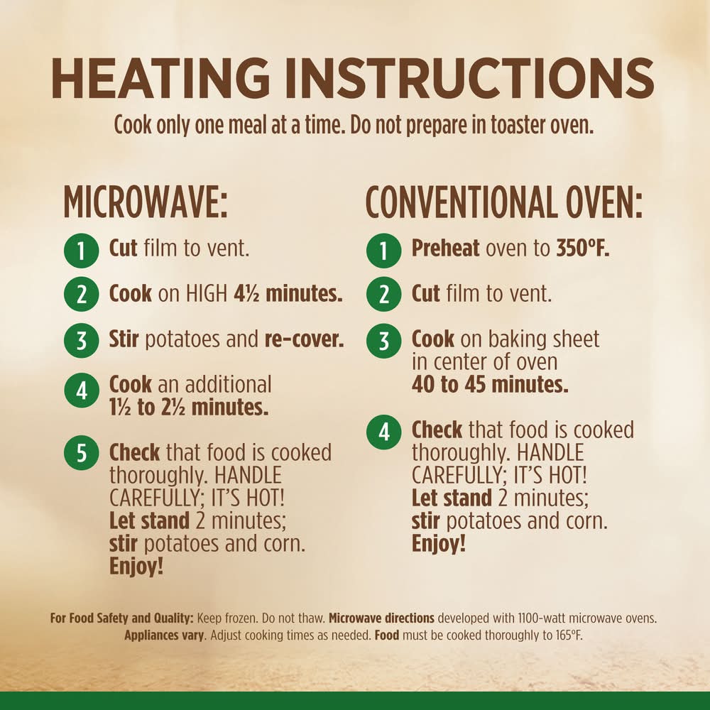 Directions for use: Must be cooked thoroughly. Microwave Oven: Cook only once at a time. (1)b Cut film to vent. (2) Cook on high 4-1/2 minutes. (3) Stir potatoes and re-cover. (4) Cook and additional 1-1/2 to 2-1/2 minutes. (5) Check that food is cooked thoroughly. Handle carefully; it’s hot! Let stand 2 minutes; stir potatoes and corn. Enjoy! Conventional Oven: Do not prepare in toaster oven. Preheat oven to 350 degrees F. Cut film to vent. Cook on baking sheet in center of oven 40 to 45 minutes. Check that food is cooked thoroughly. Handle carefully; it’s hot! Let stand 2 minutes; stir potatoes and corn. Enjoy! For Food Safety and Quality: Keep frozen. Do not thaw. Microwave directions developed with 1100-watt microwave ovens. Appliance vary. Adjust cooking times as needed. Food must be cooked thoroughly to 165 degrees F. Keep frozen. Push here to open. Storage recommendation: Keep frozen.