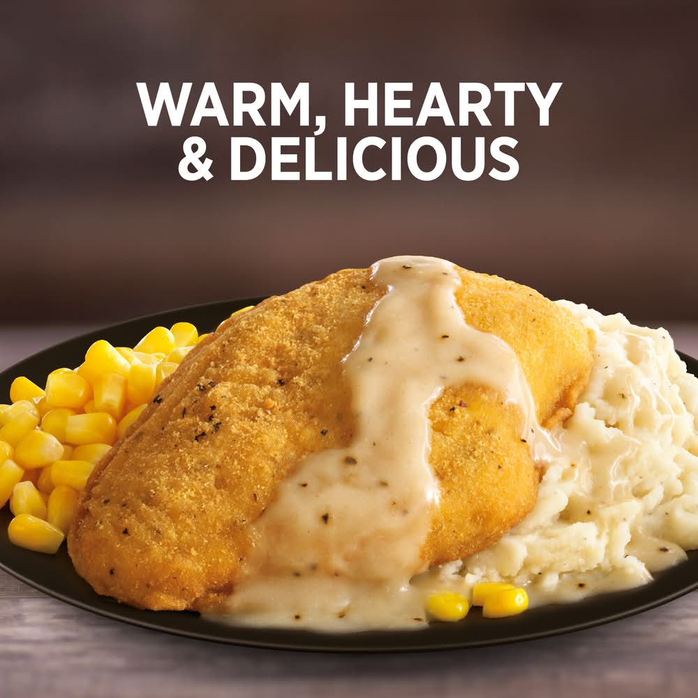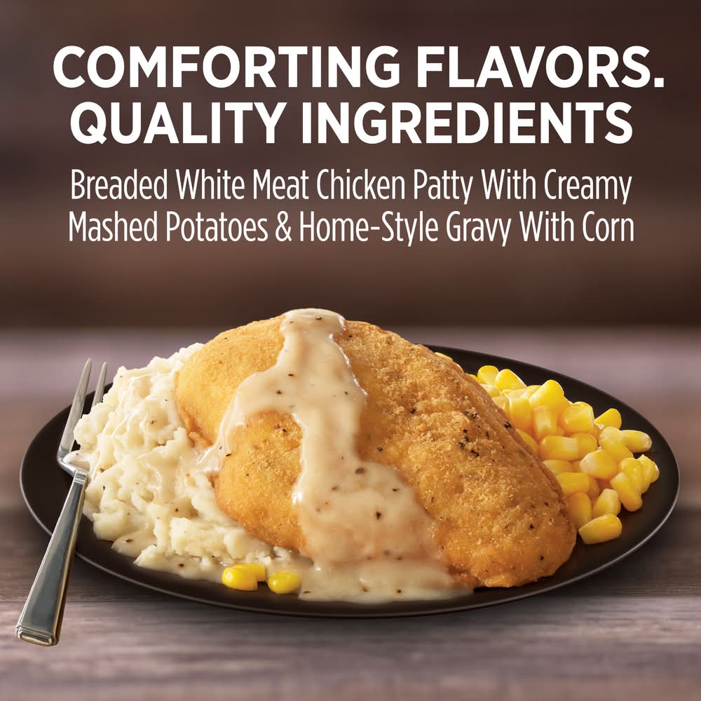 Ingredients: Mashed Potatoes (Rehydrated Potato Flakes and Granules [Water, Potatoes, Mono- and Diglycerides, Citric Acid, Disodium Dihydrogen Pyrophosphate, BHT, Sodium Bisulfite], Butter [Cream, Salt], Cream, Salt, Flavoring), Breaded White Meat Chicken Patty (White Meat Chicken, Breader [Bleached Wheat Flour, Yellow Corn Flour, Salt, Spices, Leavening {Sodium Aluminum Phosphate, Sodium Bicarbonate}, Spice Extractive], Water, Batter [Water, Yellow Corn Flour, Corn Starch, Salt, Spices, Guar Gum, Leavening {Sodium Acid Pyrophosphate, Sodium Bicarbonate, Monocalcium Phosphate}, Garlic Powder], Textured Soy Protein Concentrate, Less than 2% of: Potassium Salt, Autolyzed Yeast Extract, Sodium Phosphates, Salt, Flavorings, Fried in Vegetable Oil), Corn, Gravy (Water, Cream, Modified Corn Starch, Butter [Cream, Salt], Soybean Oil, Less than 2% of: Nonfat Dry Milk, Chicken Flavor [Chicken Broth, Salt, Chicken Fat], Chicken Glace [Chicken Broth, Cooked Chicken, Chicken Fat, Salt, Natural Flavorings], Salt, Onions, Chardonnay Wine, Canola Oil, Garlic, Spice, Xanthan Gum, Guar Gum), Water Contains: Milk, Soybeans, Wheat, Sulfites