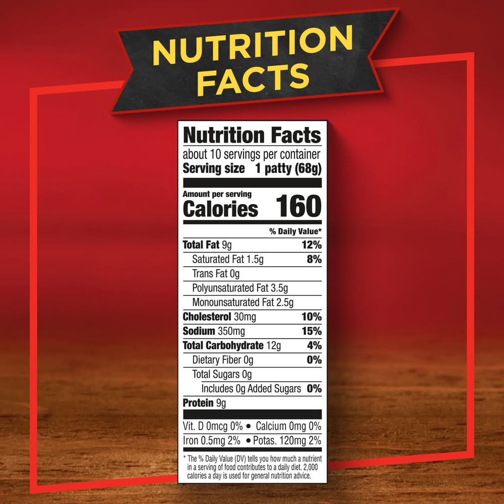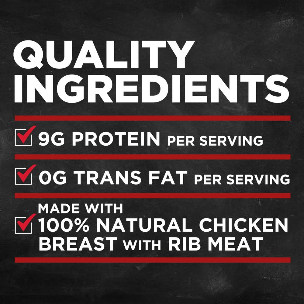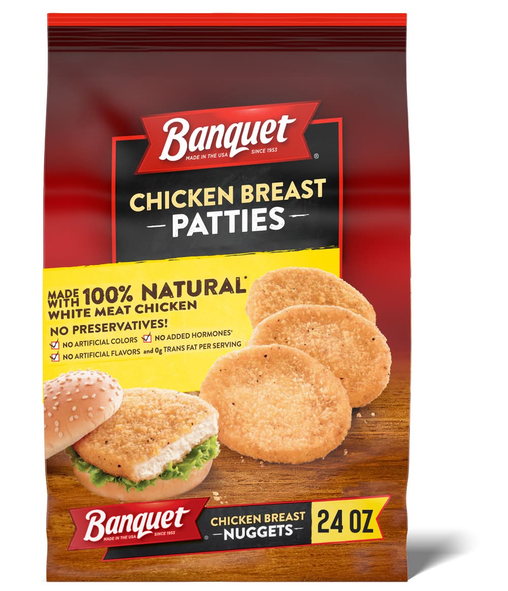 Banquet Chicken Breast Patties make a quick and easy meal with a kick that your family will love. Golden and crispy, these frozen chicken patties are made with 100% natural* white meat chicken breast with rib meat. Best of all, these chicken patties contain no preservatives, no artificial colors or flavors and no added hormones**. This microwave chicken is ready in minutes. Great for a chicken sandwich, easy weeknight meals or finger foods at parties, this frozen food heats quickly in a conventional oven for fresh-baked taste or in a microwave for quicker cook time. Keep this resealable 24 ounce bag of breaded chicken frozen meat in the freezer until ready to prepare. Proudly made in the U.S.A. for over 60 years, Banquet has been making delicious food the whole family loves. (*) Minimally processed, no artificial ingredients (**) Federal regulations prohibit the use of added hormones in chicken • Flavor: Chicken breast • Number of servings: 10 • Conagra Brands, Chicago, IL, 60654 • Packaging: Reusable