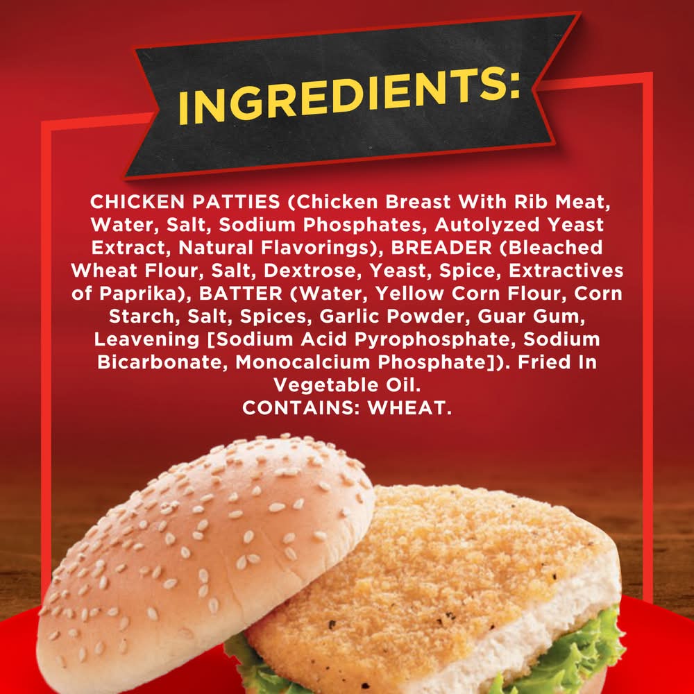 Ingredients: Chicken Breast with Rib Meat, Water, Breader (Bleached Wheat Flour Salt Dextrose Yeast Soybean Oil Spice Extractives of Paprika), Batter (Water Yellow Corn Flour Cornstarch Dextrose Salt Spices Sugar Yeast Extract Modified Food Starch Garlic Powder Guar Gum Leavening [Sodium Acid Pyrophosphate Sodium Bicarbonate Monocalcium Phosphate]), Textured Soy Flour, Soy Flour, Contains 2% or Less of: Modified Food Starch, Salt, Autolyzed Yeast Extract, Sodium Tripolyphosphate, Flavoring, Spice. Fried in Vegetable Oil with BHT Contains: Soybeans, Wheat