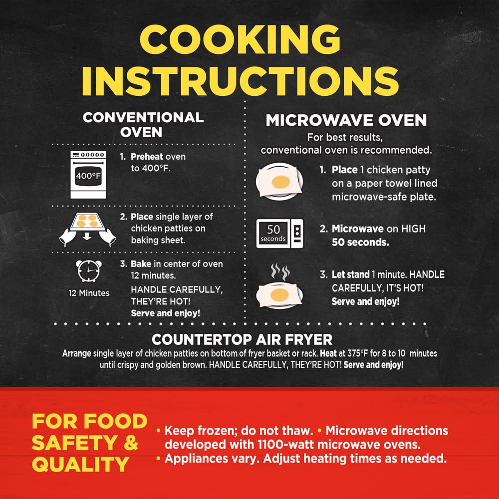 Directions for use: Conventional Oven: 1. Preheat oven to 400 degrees F. 2. Place single layer of chicken patties on baking sheet. 3. Bake in center of oven 12 minutes. Handle carefully; they're hot! Serve and enjoy! Microwave Oven: For best results, conventional oven is recommended. 1. Place 1 chicken patty on a paper towel lined microwave-safe plate. 2. Microwave on high 50 seconds. 3. Let stand 1 minute. Handle carefully, it's hot! Enjoy! For Food Safety and Quality: Keep frozen; do not thaw. Microwave directions developed with 1100-watt microwave ovens. Appliances vary. Adjust heating times as needed. Storage recommendation: Keep frozen.