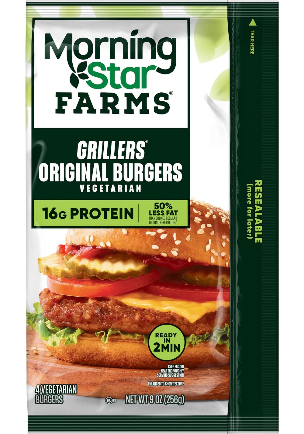 MorningStar Farms Grillers Original veggie burger patties offer a classic, char-grilled taste and a great texture in every savory bite. With 50% less fat than regular cooked ground beef, these vegetarian burgers provide 16g of protein (24% of daily value) and are a good source of fiber (7g total fat per serving). Made with high-quality ingredients and no artificial flavors or colors, these meatless burgers are a delicious and healthy choice; Keep a convenient resealable bag in your freezer for a hearty dish anytime. Pair these vegetarian burgers with your favorite summer sides like potato chips, salads, or French fries. Whether you're looking for a quick lunch, dinner, or grilling for a summer barbecue, MorningStar Farms Grillers Original veggie burgers are sure to delight both vegetarians and meat-lovers alike. Cooked regular ground beef patty contains 14g total fat per serving (64g). MorningStar Farms Grillers Original Burger contains 7g total fat per serving (64g). • Kellogg Sales Co., Battle Creek, MI, 49016 • Packaging: Reusable