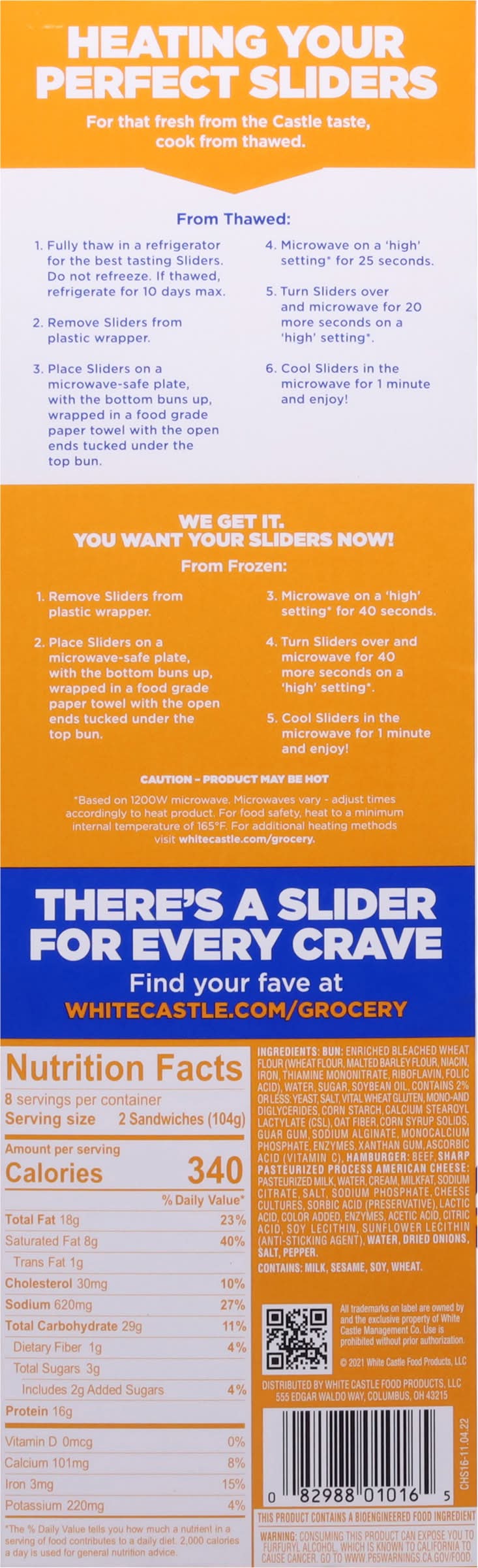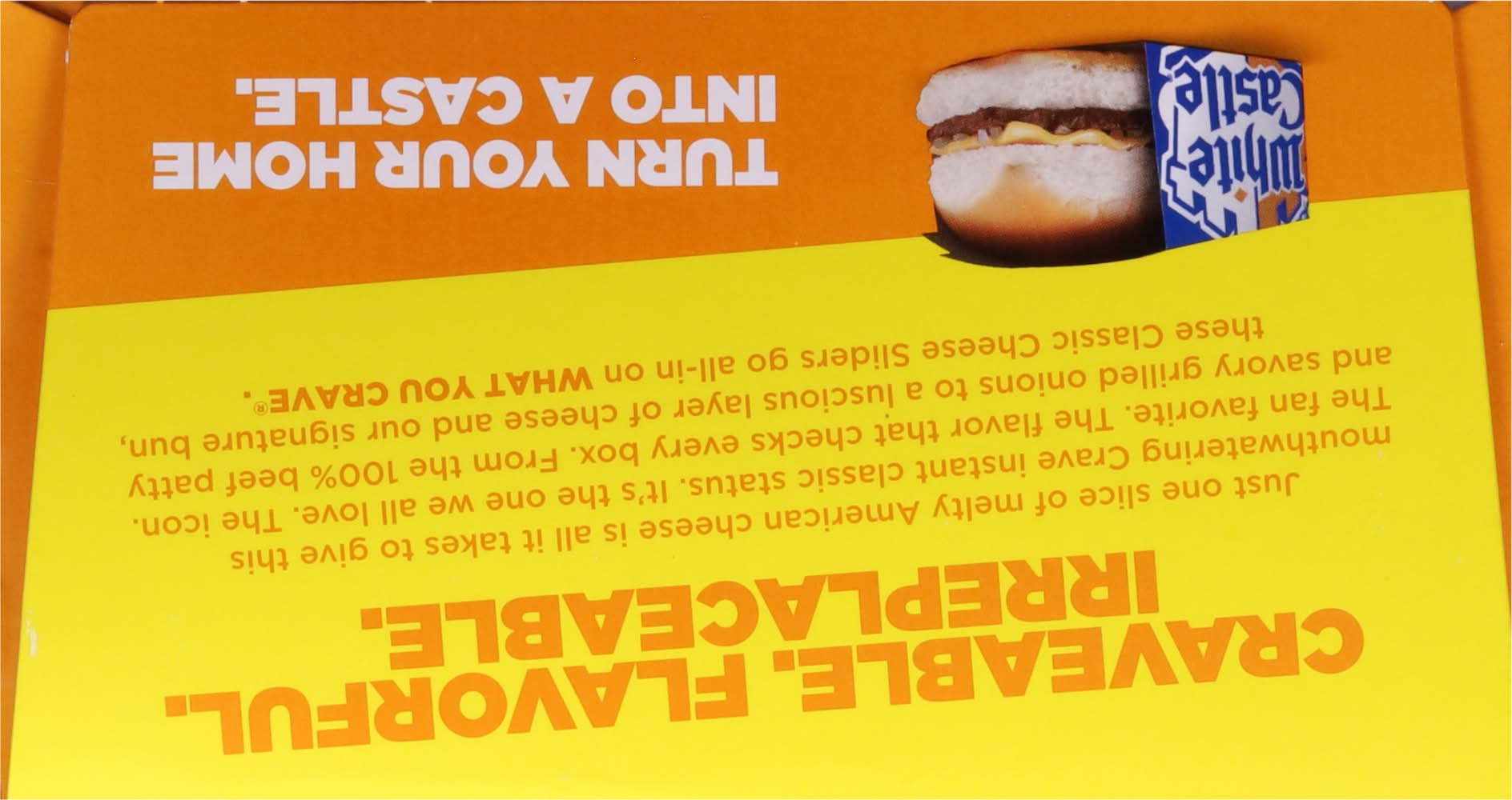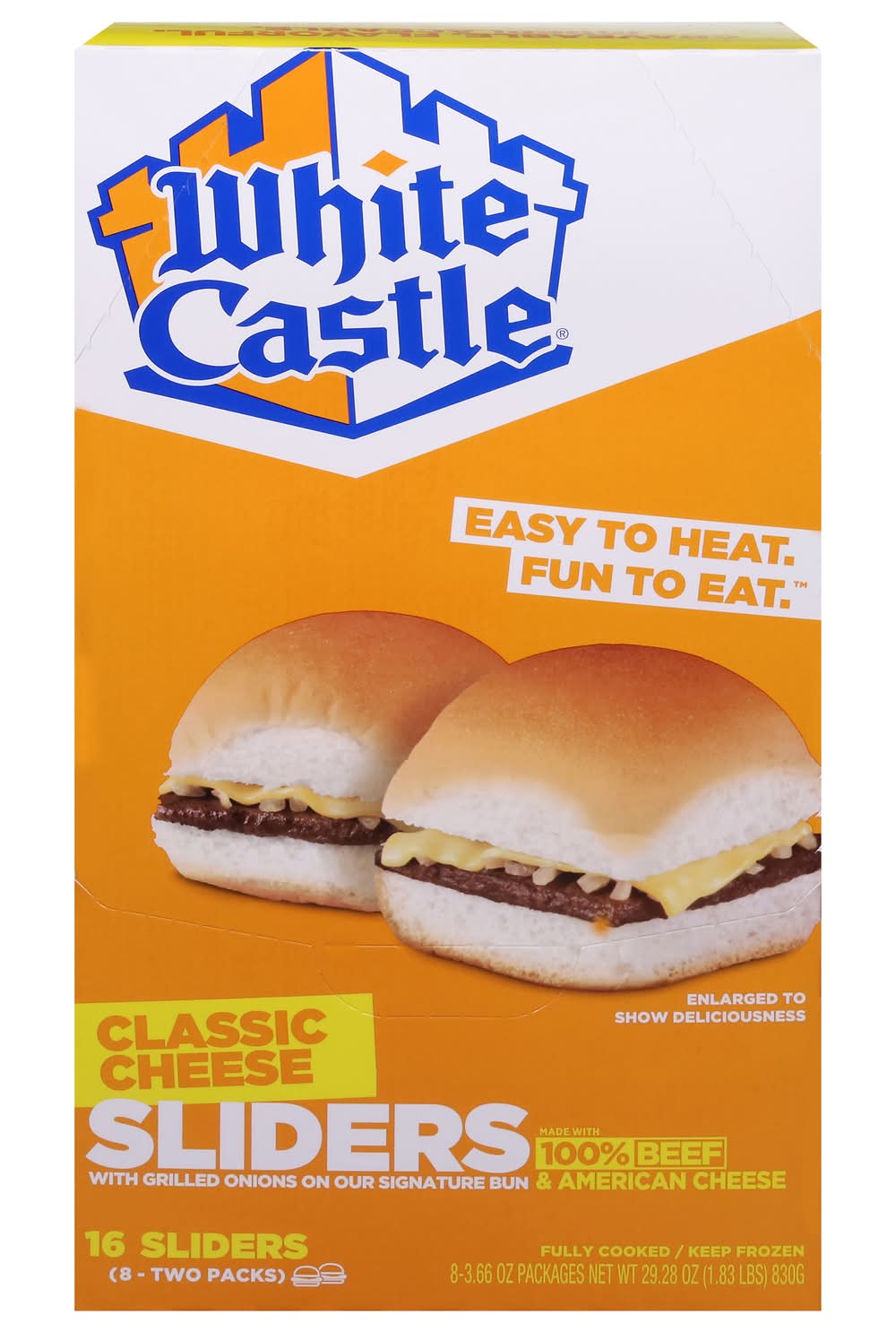 Sliders, Classic Cheese • Flavor: Classic cheese • Pack size: 8 • White castle food products, llc, 555 Edgar Waldo Way