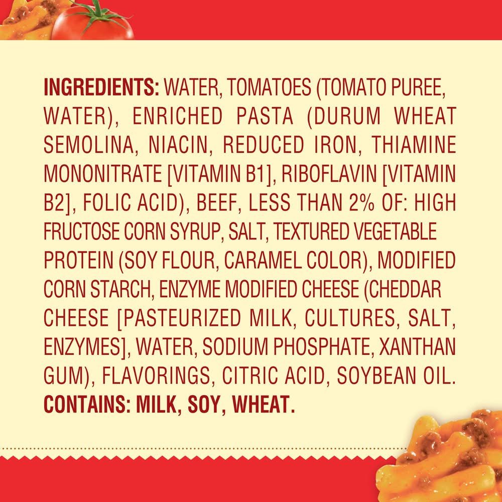 Ingredients: Water, Tomatoes (Tomato Puree, Water), Enriched Pasta (Durum Wheat Semolina, Niacin, Reduced Iron, Thiamine Mononitrate [Vitamin B1], Riboflavin [Vitamin B2], Folic Acid), Beef, LESS THAN 2% OF: High Fructose Corn Syrup, Salt, Textured Vegetable Protein (Soy Flour, Caramel Color), Modified Corn Starch, Enzyme Modified Cheese (Cheddar Cheese [Pasteurized Milk, Cultures, Salt, Enzymes], Water, Sodium Phosphate, Xanthan Gum), Flavorings, Citric Acid, Soybean Oil. CONTAINS: MILK, SOY, WHEAT Contains: Milk, Soy, Wheat