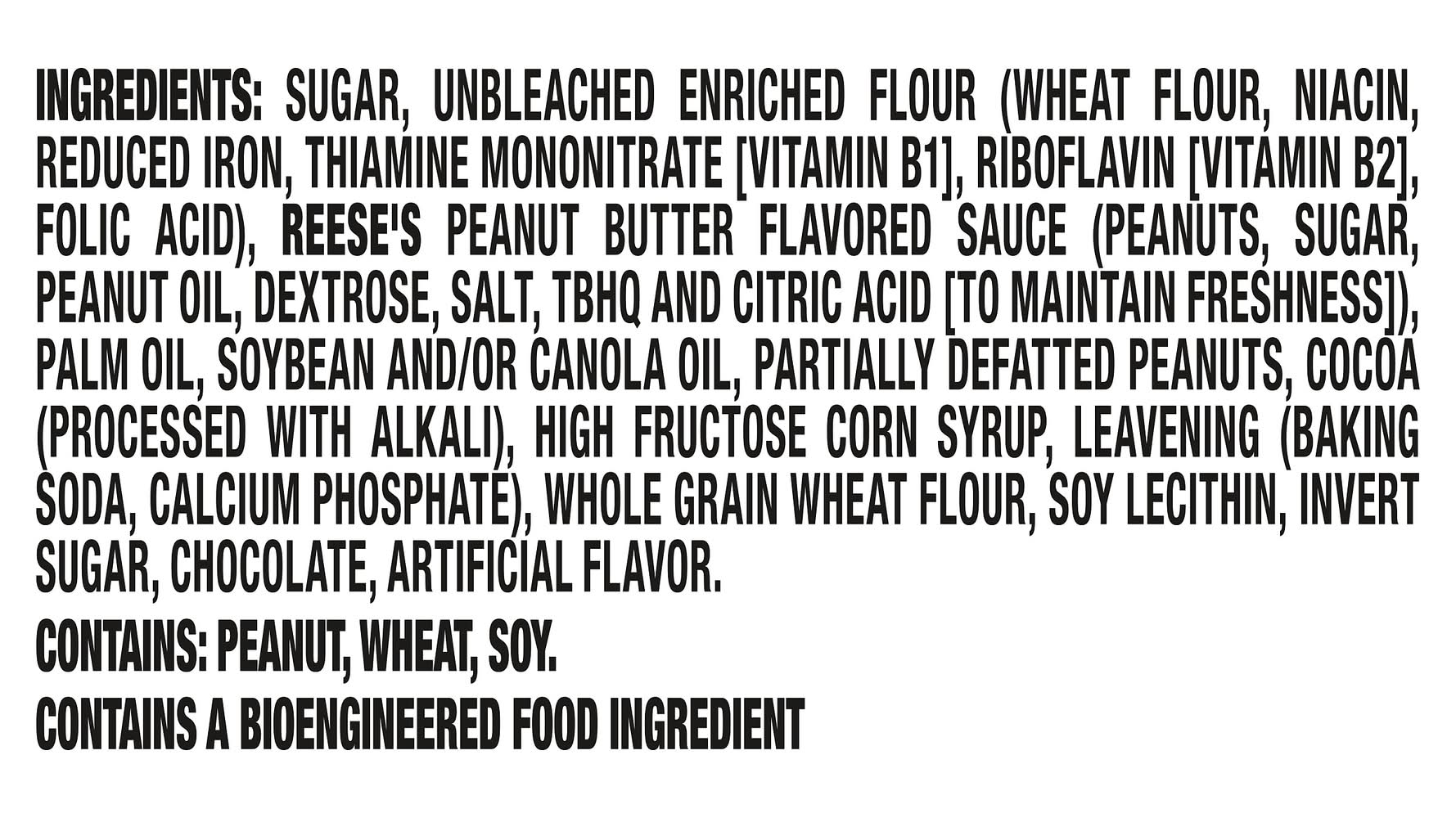 Ingredients: INGREDIENTS: SUGAR, UNBLEACHED ENRICHED FLOUR (WHEAT FLOUR, NIACIN, REDUCED IRON, THIAMINE MONONITRATE [VITAMIN B1], RIBOFLAVIN [VITAMIN B2], FOLIC ACID), REESE'S PEANUT BUTTER FLAVORED SAUCE (PEANUTS, SUGAR, PEANUT OIL, DEXTROSE, SALT, TBHQ AND CITRIC ACID [TO MAINTAIN FRESHNESS]), PALM OIL, SOYBEAN AND, OR CANOLA OIL, PARTIALLY DEFATTED PEANUTS, COCOA (PROCESSED WITH ALKALI), HIGH FRUCTOSE CORN SYRUP, LEAVENING (BAKING SODA, CALCIUM PHOSPHATE), WHOLE GRAIN WHEAT FLOUR, SOY LECITHIN, INVERT SUGAR, CHOCOLATE, ARTIFICIAL FLAVOR. CONTAINS: PEANUT, WHEAT, SOY. Contains: CONTAINS: PEANUT, WHEAT, SOY.