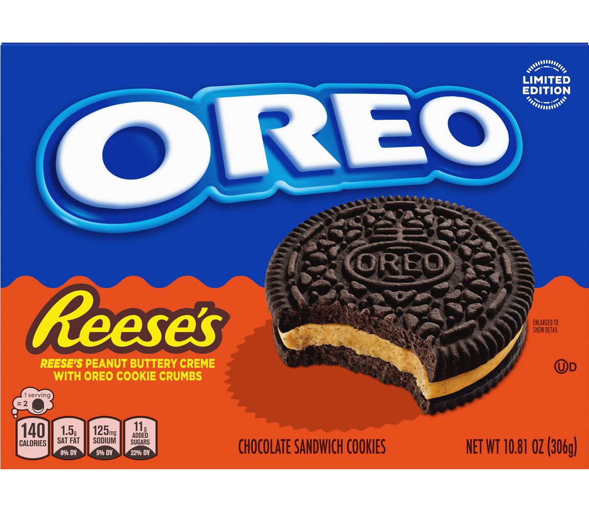 You asked for it! The iconic brands of OREO and REESE'S have collaborated to create one delicious treat: OREO REESE'S Peanut Buttery Creme Chocolate Sandwich Cookies! These limited edition cookies feature creme filling made with real REESE'S Peanut Butter sauce and OREO cookie crumb inclusions sandwiched between two signature OREO chocolate wafer cookies. Sweet snacks for sharing with friends or enjoying solo, OREO REESE'S Peanut Buttery Creme snack cookies combine the best parts of both products – peanut butter and chocolate flavors – for the ultimate treat. Enjoy OREO REESE'S sandwich cookies on their own or with milk as after-lunch snacks. These tasty, fun snacks make wonderful birthday treats or movie snacks for a girls trip, game night, or movie night. The certified kosher OREO cookies also make fantastic office snacks or after-school snacks. With OREO REESE'S Peanut Buttery Creme Chocolate Sandwich Cookies, you’ll be ready for any snacking occasion. Flavor: Peanut butter