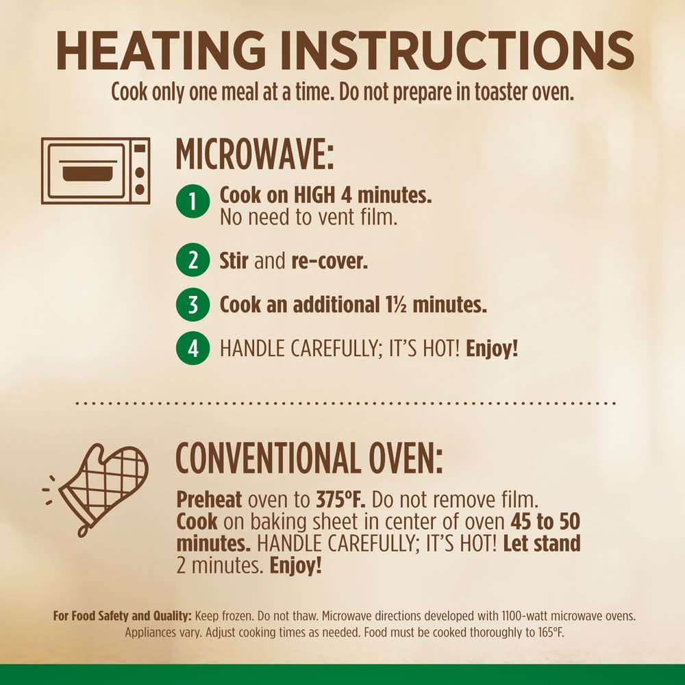 Directions for use: Microwave Oven: Cook only one at a time. Cook on high 4 minutes. No need to vent film. Stir and re-cover. Cook an additional 1-1/2 minutes. Check that food is cooked thoroughly to 165 degrees F. Handle carefully; It's hot! Enjoy! Conventional Oven: Do not prepare in toaster oven. Preheat oven to 375 degrees F. Do not remove film. Cook on baking sheet in center of oven 45 to 50 minutes. Check that food is cooked thoroughly to 165 degrees F. Handle carefully; It's hot! Let stand 2 minutes. Enjoy! For Food Safety and Quality: Keep frozen. Do not thaw. Microwave directions developed with 1100-watt microwave ovens. Appliances vary. Adjust cooking times as needed. Food must be cooked thoroughly to 165 degrees F. Keep frozen. Storage recommendation: Keep frozen.