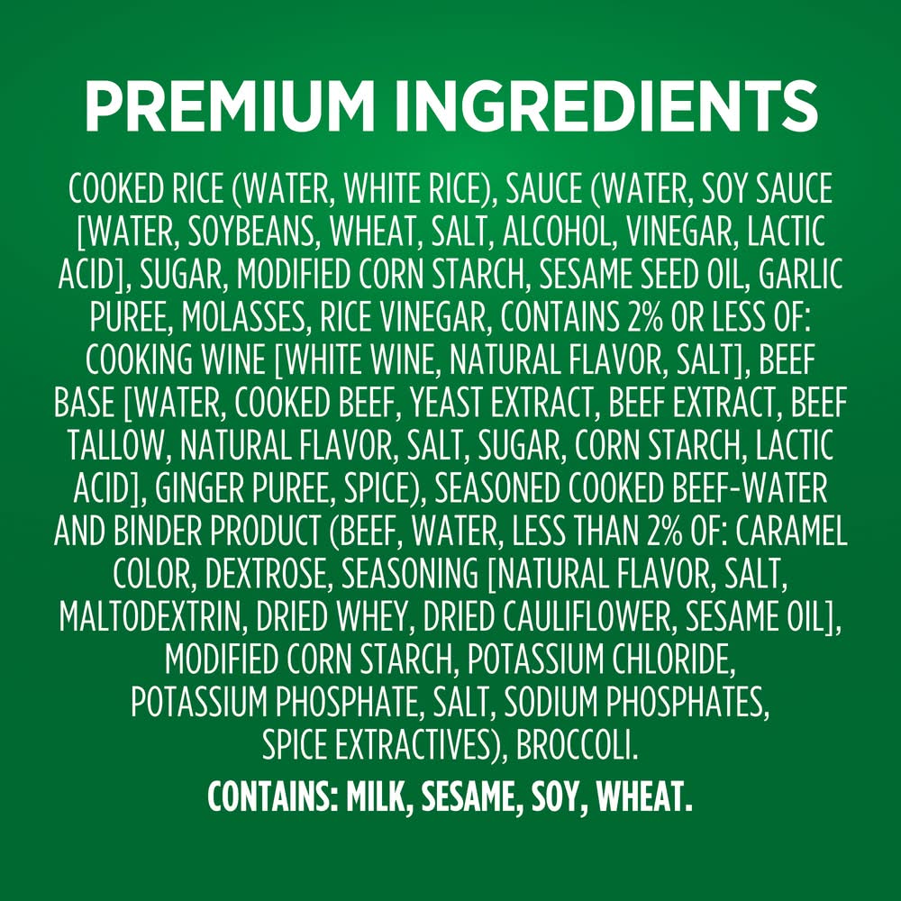 Ingredients: Sauce (Water, Onions, Soy Sauce [Water, Wheat, Soybeans, Salt, Alcohol, Vinegar, Lactic Acid], Sugar, Modified Corn Starch, Sesame Seed Oil, Contains 2% or less of: Garlic, Molasses, Rice Vinegar, Cooking Wine [White Wine, Natural Flavor, Salt], Beef Base [Water, Cooked Beef, Yeast Extract, Beef Extract, Beef Tallow, Natural Flavor, Salt, Sugar, Corn Starch, Lactic Acid], Ginger, Spice), Cooked Rice (Water, White Rice), Seasoned Cooked Beef-Water and Binder Product (Beef, Water, Less than 2% of: Caramel Color, Dextrose, Seasoning [Natural Flavor, Salt, Maltodextrin, Dried Whey, Dried Cauliflower, Sesame Oil], Modified Corn Starch, Potassium Chloride, Potassium Phosphate, Salt, Sodium Phosphates, Spice Extractives), Broccoli. CONTAINS: MILK, SOY, WHEAT. Contains: Milk, Sesame, Soy, Wheat