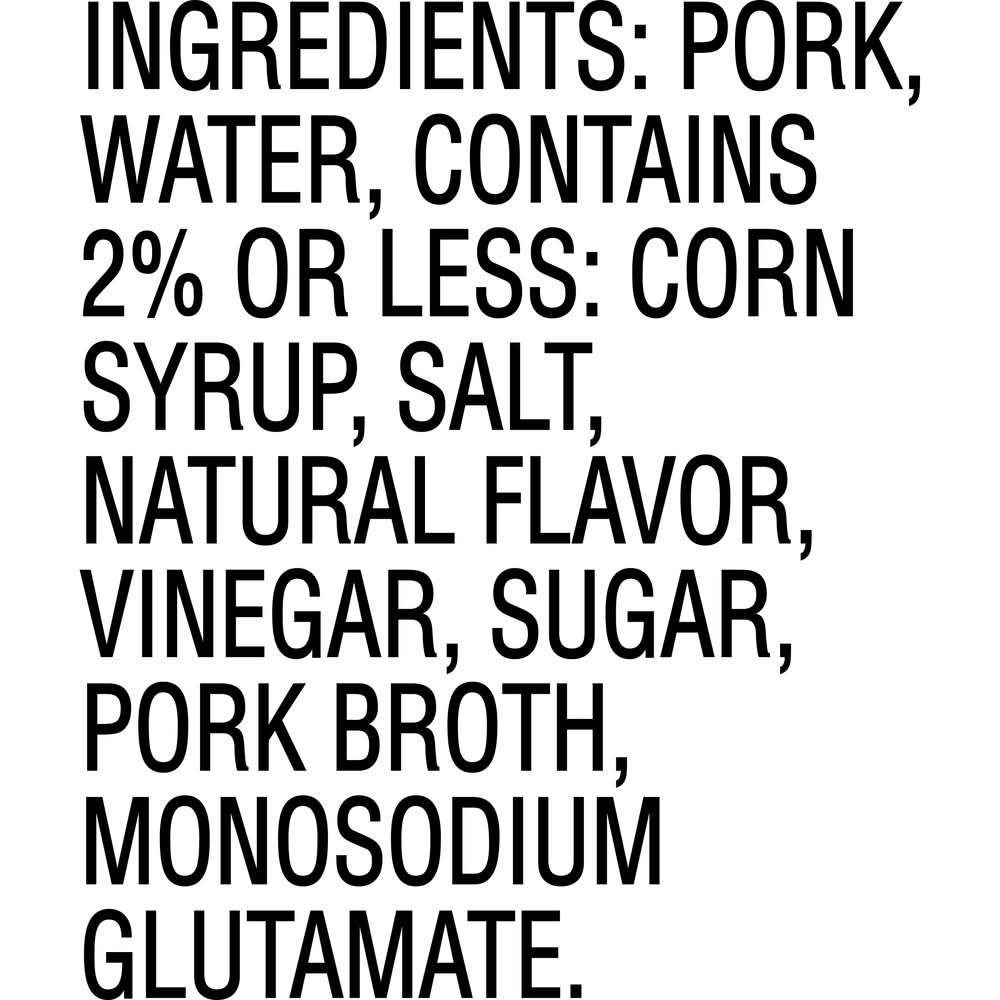 Ingredients: Pork, Water, Contains 2% or Less: Corn Syrup, Salt, Natural Flavor, Vinegar, Sugar, Pork Broth, Monosodium Glutamate., Contains 2% or Less: Pork Broth, Spices Contains: Corn