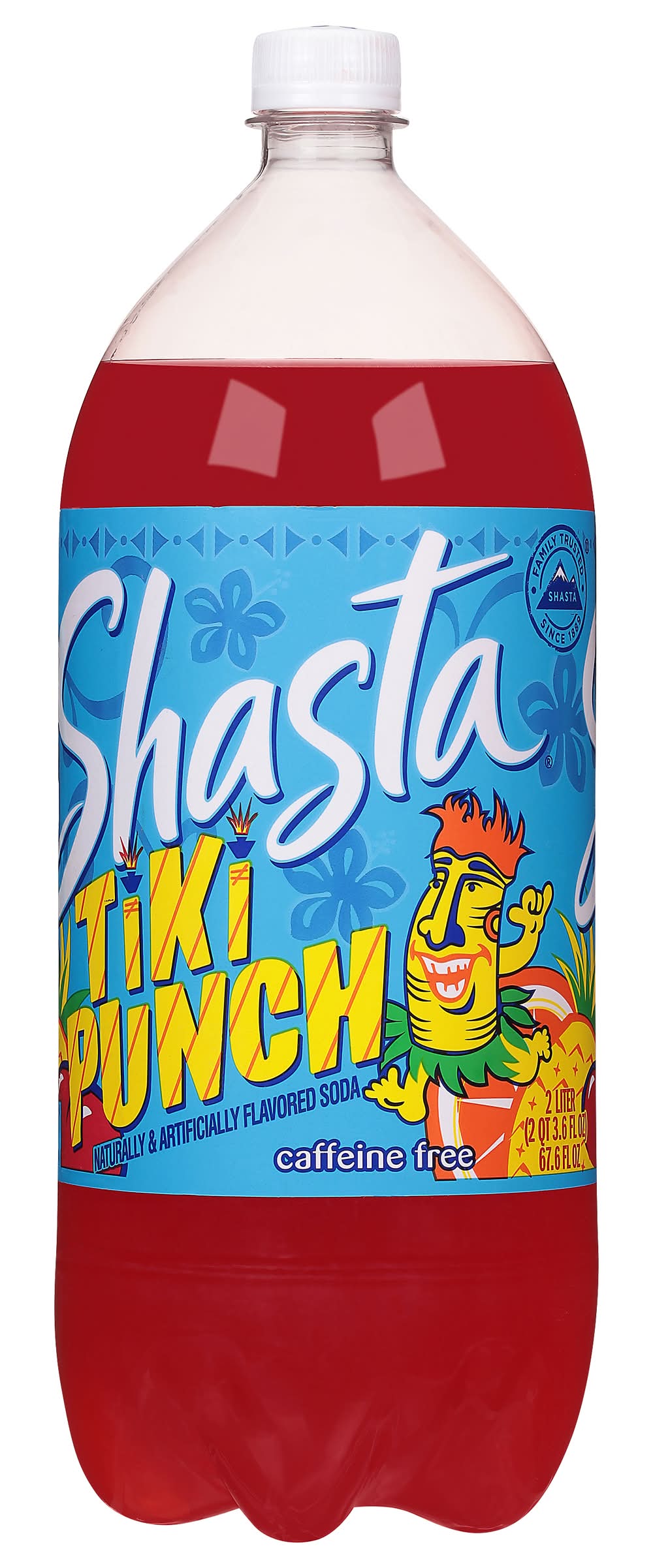 Soda, Caffeine Free, Tiki Punch • Number of servings: 6 • Shasta Beverages, Inc., Hayward, CA, 94545, Ph: 800-834-9980 • Packaging: Reusable