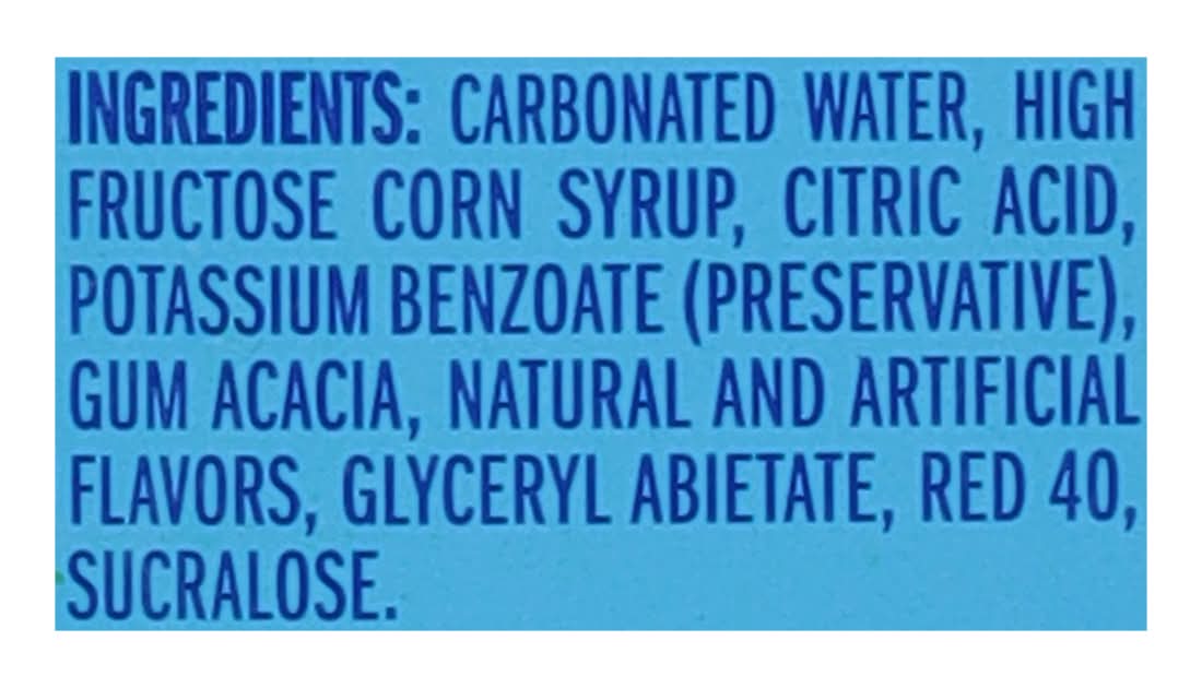 Ingredients: Carbonated Water, High Fructose Corn Syrup, Citric Acid, Potassium Benzoate (Preservative), Gum Acacia, Natural and Artificial Flavors, Glyceryl Abietate, Red 40, Sucralose Contains: Corn