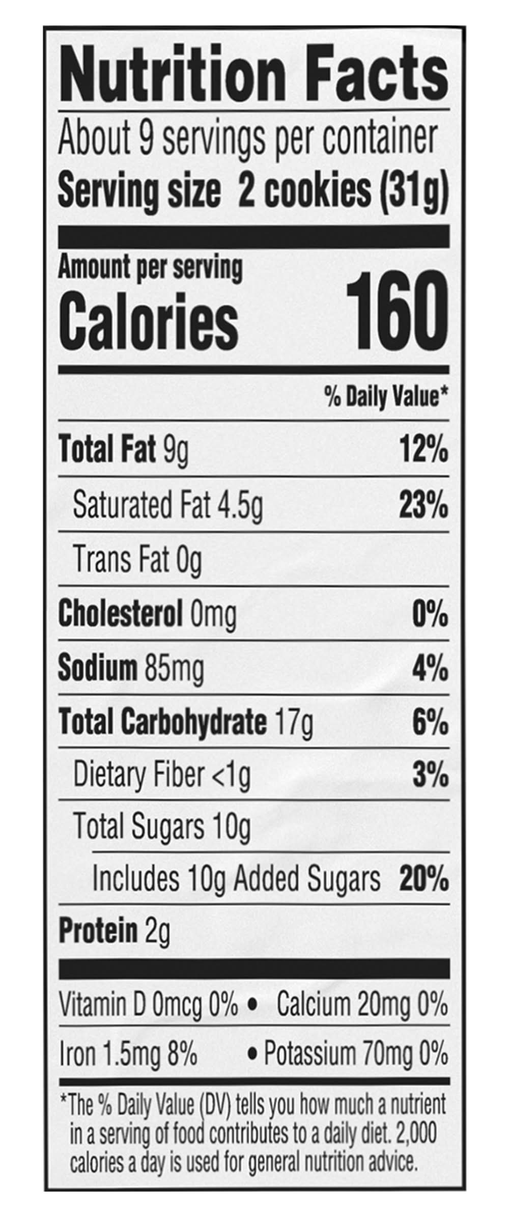 Ingredients: Sugar, Enriched Wheat Flour (Flour, Niacin, Reduced Iron, Thiamine Mononitrate, Riboflavin, Folic Acid), Peanut Butter (Peanuts, Hydrogenated Palm Oil, Corn Syrup Solids, Salt), Vegetable Oil Shortening (Palm Kernel and Palm Oils), Canola and/or Soybean Oil, Cocoa (Processed with Alkali), Invert Sugar, Leavening (Baking Soda, Monocalcium Phosphate, Ammonium Bicarbonate), Soy Lecithin, Salt, Artificial Flavor Contains: Wheat, Soybeans, Peanuts, Corn, Milk, Tree Nuts, Coconuts