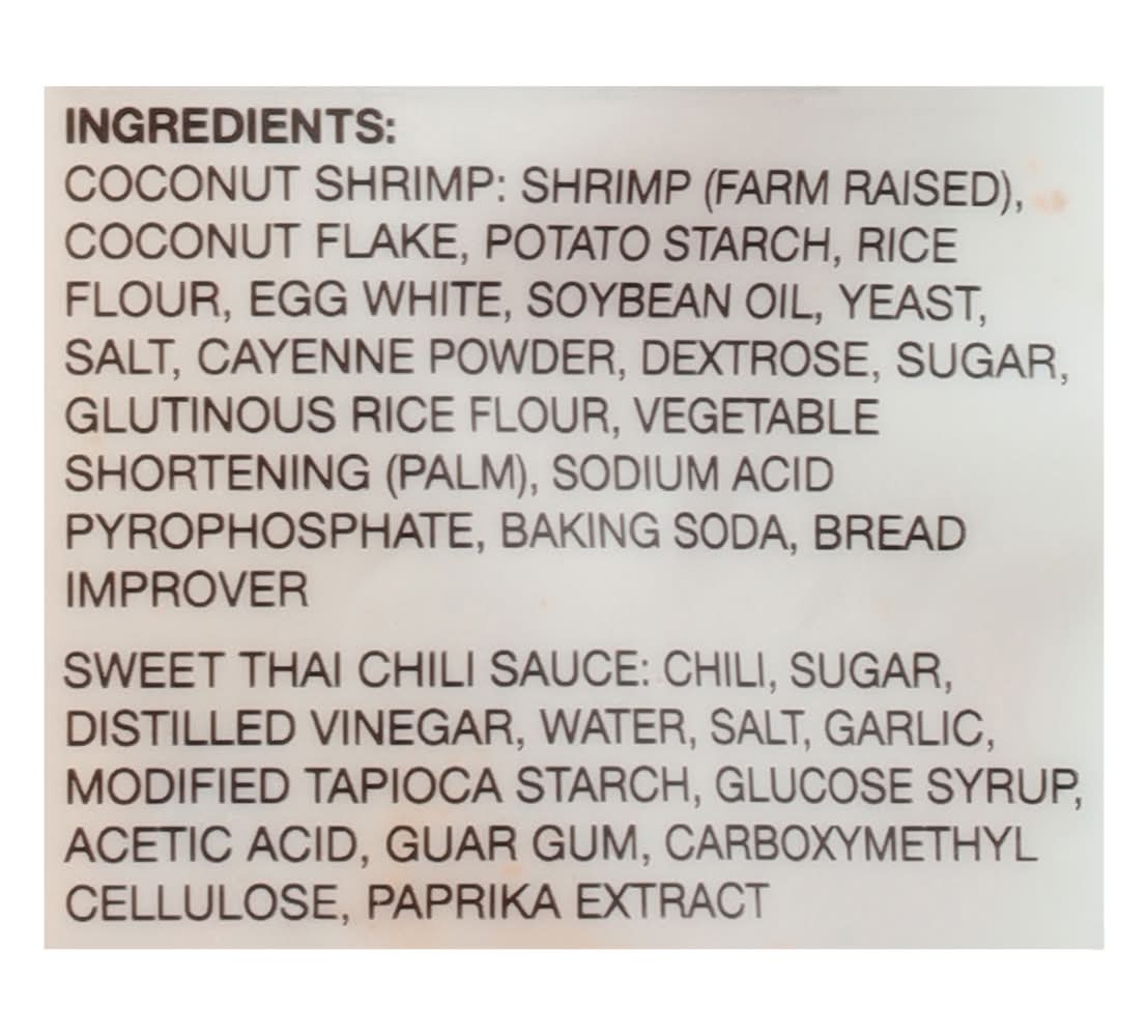 Ingredients: Coconut Shrimp: Shrimp (Farm Raised), Coconut Flake, Potato Starch, Rice Flour, Egg White, Soybean Oil, Yeast, Salt, Cayenne Powder, Dextrose, Sugar, Glutinous Rice Flour, Vegetable Shortening (Palm), Sodium Acid Pyrophosphate, Baking Soda, Bread Improver, Sweet Thai Sauce: Chili, Sugar, Distilled Vinegar, Water, Salt, Garlic, Modified Tapioca Starch, Glucose Syrup, Acetic Acid, Guar Gum, Carboxymethyl Cellulose, Paprika Extract Contains: Tree Nuts, Coconuts, Crustacean Shellfish, Shrimp, Eggs, Soybeans