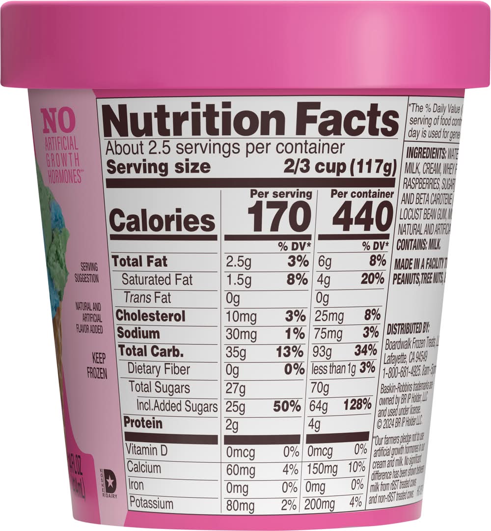 Ingredients: Water, Sugar, Corn Syrup, Nonfat Milk, Cream, Whey Powder, Raspberry Puree [Red Raspberries, Sugar], Citric Acid, Spirulina Extract and Beta Carotene (Colors), Contains 2% or Less of: Locust Bean Gum, Modified Cellulose, Guar Gum], Natural and Artificial Flavors, Vegetable Juice (Color) Contains: Milk
