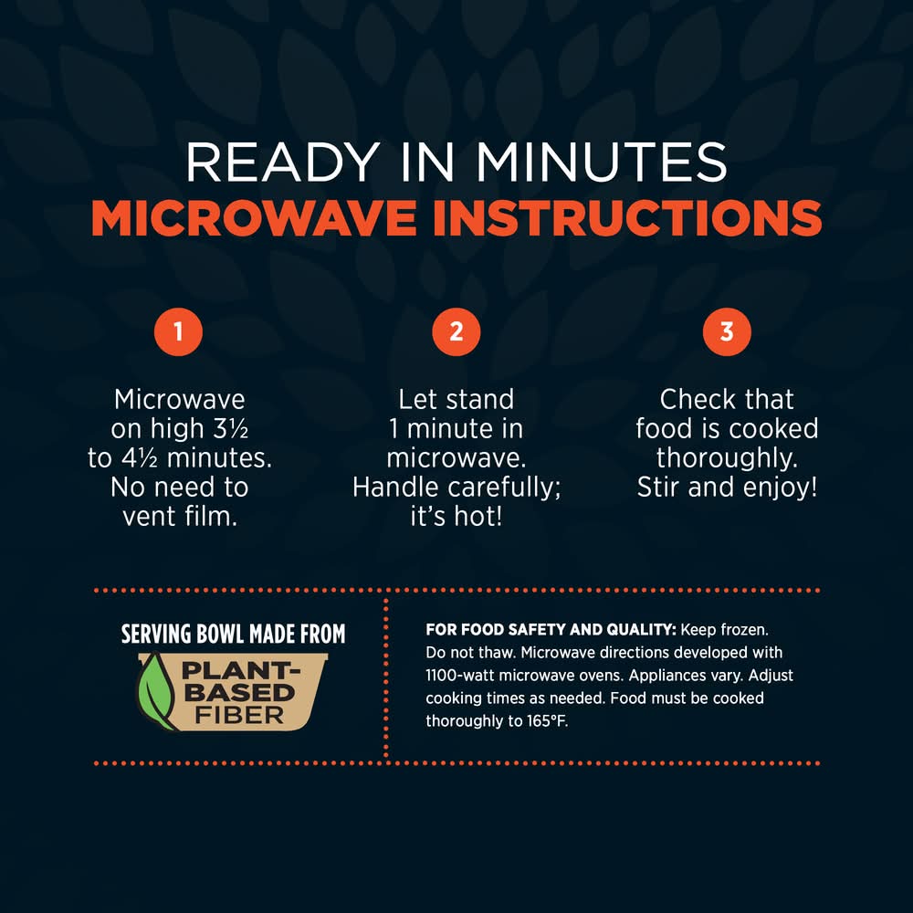Microwave oven: 1. microwave on high 3-1/2 to 4-1/2 minutes. no need to vent film. 2. let stand 1 minute in microwave. handle carefully; it's hot! 3. check that food is cooked thoroughly. stir and enjoy! for food safety and quality: keep frozen. do not thaw. microwave directions developed with 1100-watt microwave ovens. appliances vary. adjust cooking times as needed. food must be cooked thoroughly to 165 degrees f. read and follow these cooking directions. do not use if film seal is broken. cook only one at a time. do not cook in conventional or toaster ovens. keep frozen; must be cooked thoroughly.