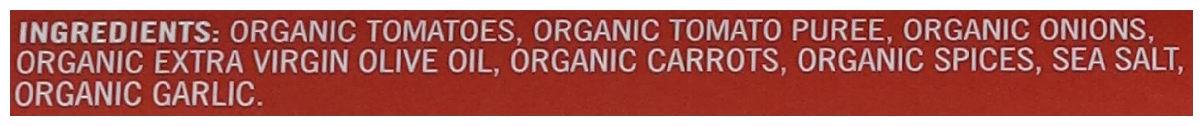 Ingredients: Organic Tomatoes, Organic Tomato Puree, Organic Onions, Organic Extra Virgin Olive Oil, Organic Carrots, Organic Spices, Sea Salt, Organic Garlic