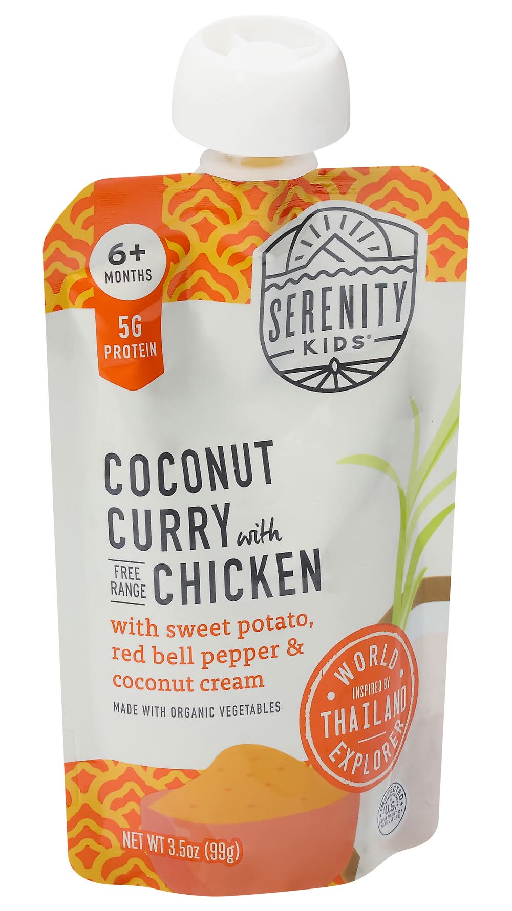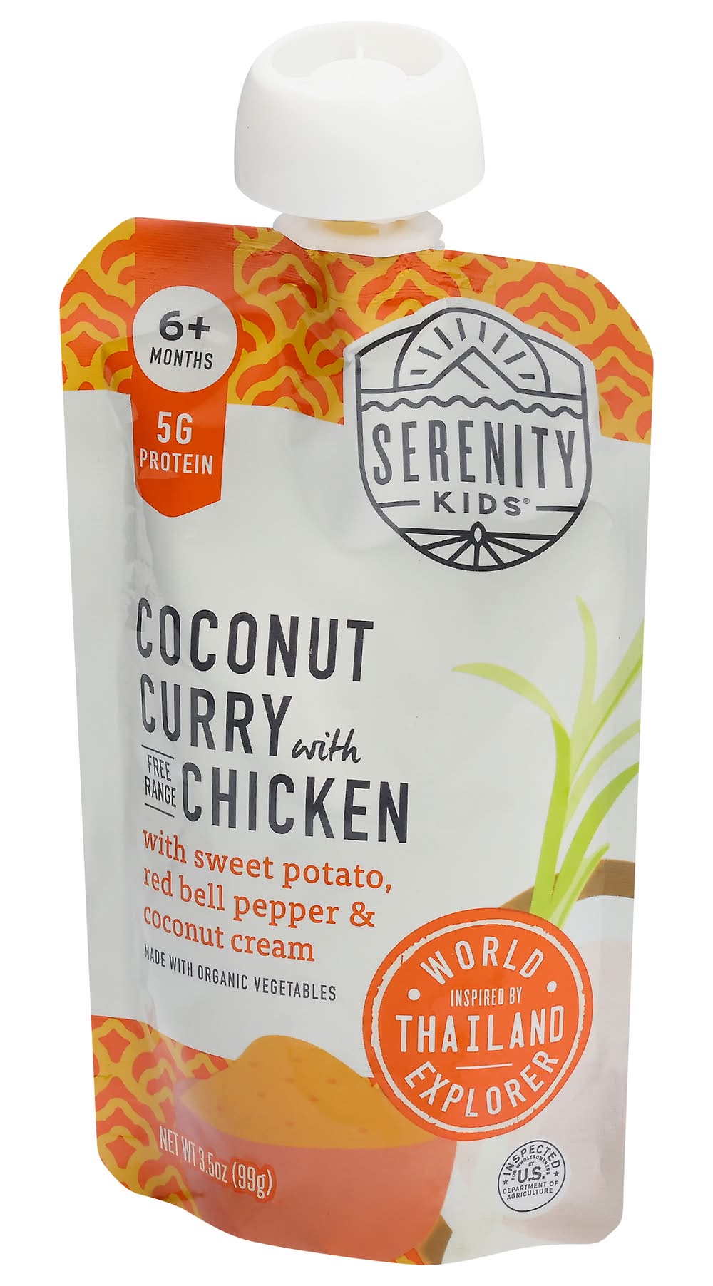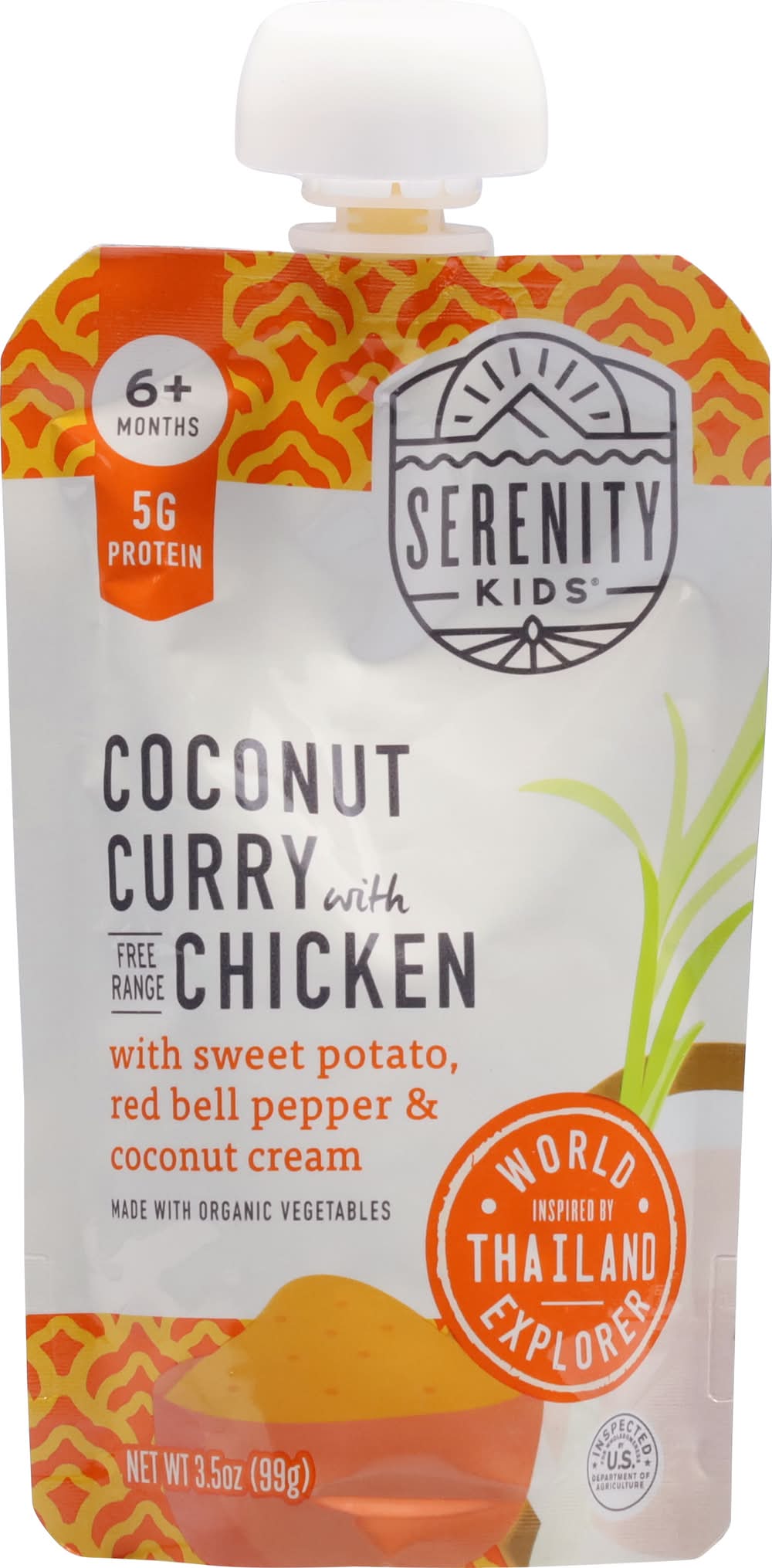 6+ months Coconut curry with free range chicken with sweet potato, red bell pepper & coconut cream. 5 g protein. Certified Organic by Oregon Tilth. No milk. No rice. No preservatives. Serenity kids. World inspired by Thialand explorer. Serenity kids explore new tastes with world flavors. Coconut curry with chicken. Free range chicken in savory coconut cream with a hint of cumin, ginger, and lemongrass to transport your little world explorer. No rice, no preservatives. Inspected for wholesomeness by U.S. Department of Agriculture BPA-free package. Terracycle. Family owned & made in the USA.