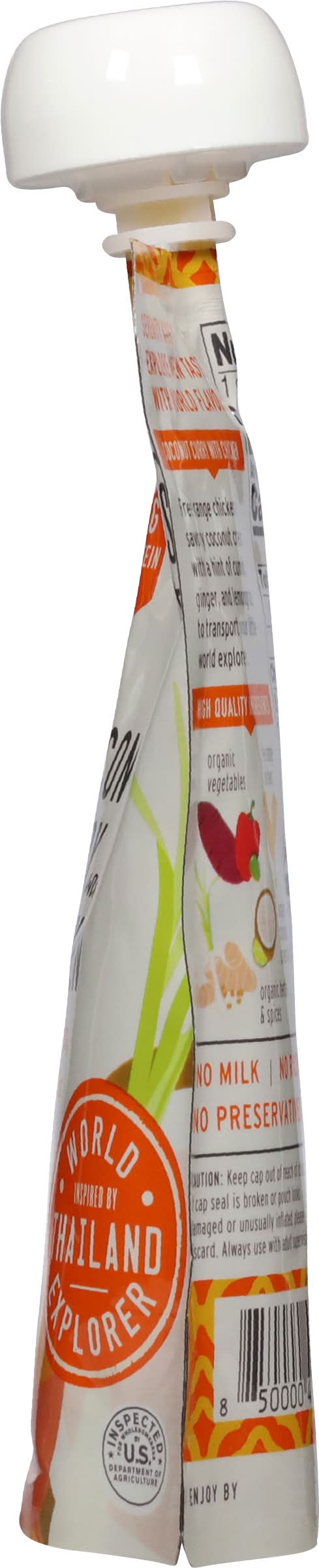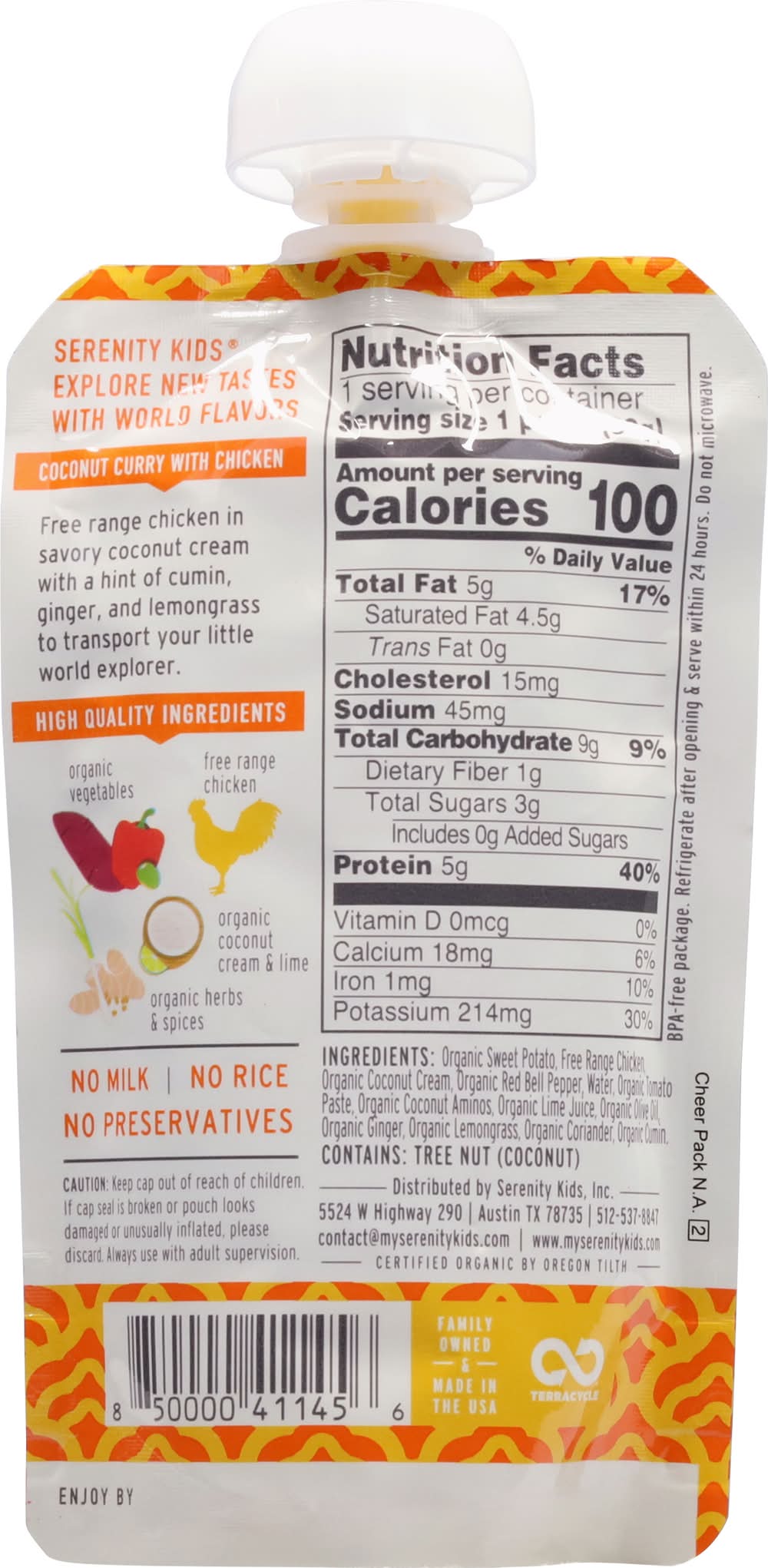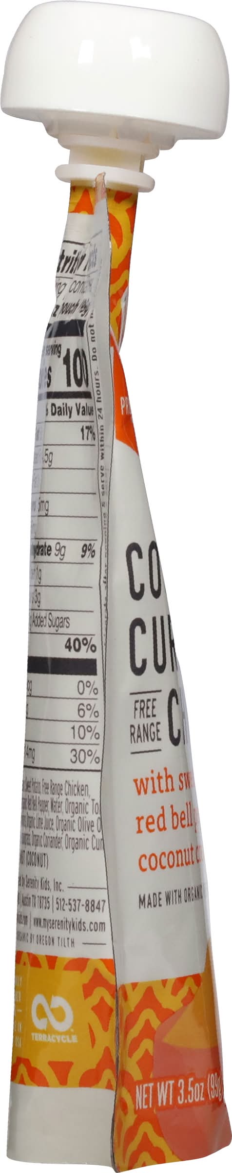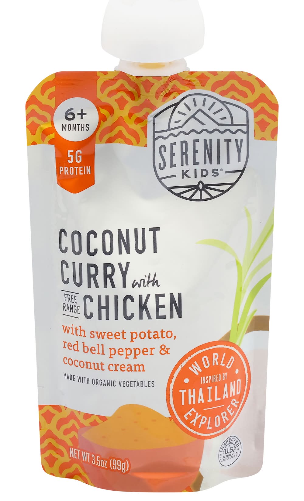 6+ months Coconut curry with free range chicken with sweet potato, red bell pepper & coconut cream. 5 g protein. Certified Organic by Oregon Tilth. No milk. No rice. No preservatives. Serenity kids. World inspired by Thialand explorer. Serenity kids explore new tastes with world flavors. Coconut curry with chicken. Free range chicken in savory coconut cream with a hint of cumin, ginger, and lemongrass to transport your little world explorer. No rice, no preservatives. Inspected for wholesomeness by U.S. Department of Agriculture BPA-free package. Terracycle. Family owned & made in the USA.