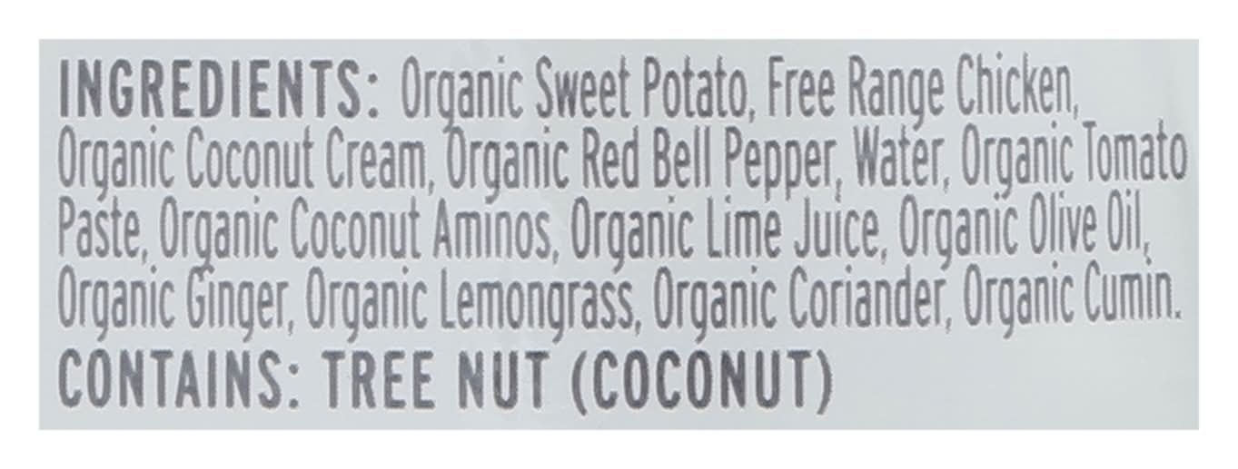 Ingredients: Organic Sweet Potato, Free Range Chicken, Organic Coconut Cream, Organic Red Bell Pepper, Water, Organic Tomato Paste, Organic Coconut Aminos, Organic Lime Juice, Organic Olive Oil, Organic Ginger, Organic Lemongrass, Organic Coriander, Organic Cumin