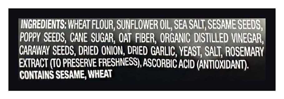 Ingredients: Wheat Flour, Sunflower Oil, Sea Salt, Sesame Seeds, Poppy Seeds, Cane Sugar, Oat Fiber, Organic Distilled Vinegar, Caraway Seeds, Dried Onion, Dried Garlic, Yeast, Salt, Rosemary Extract (to Preserve Freshness), Ascorbic Acid (Antioxidant) Contains: Sesame, Wheat, Oat