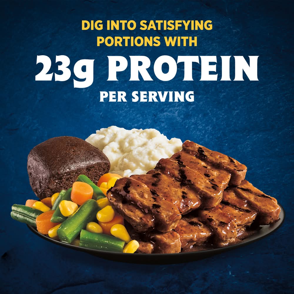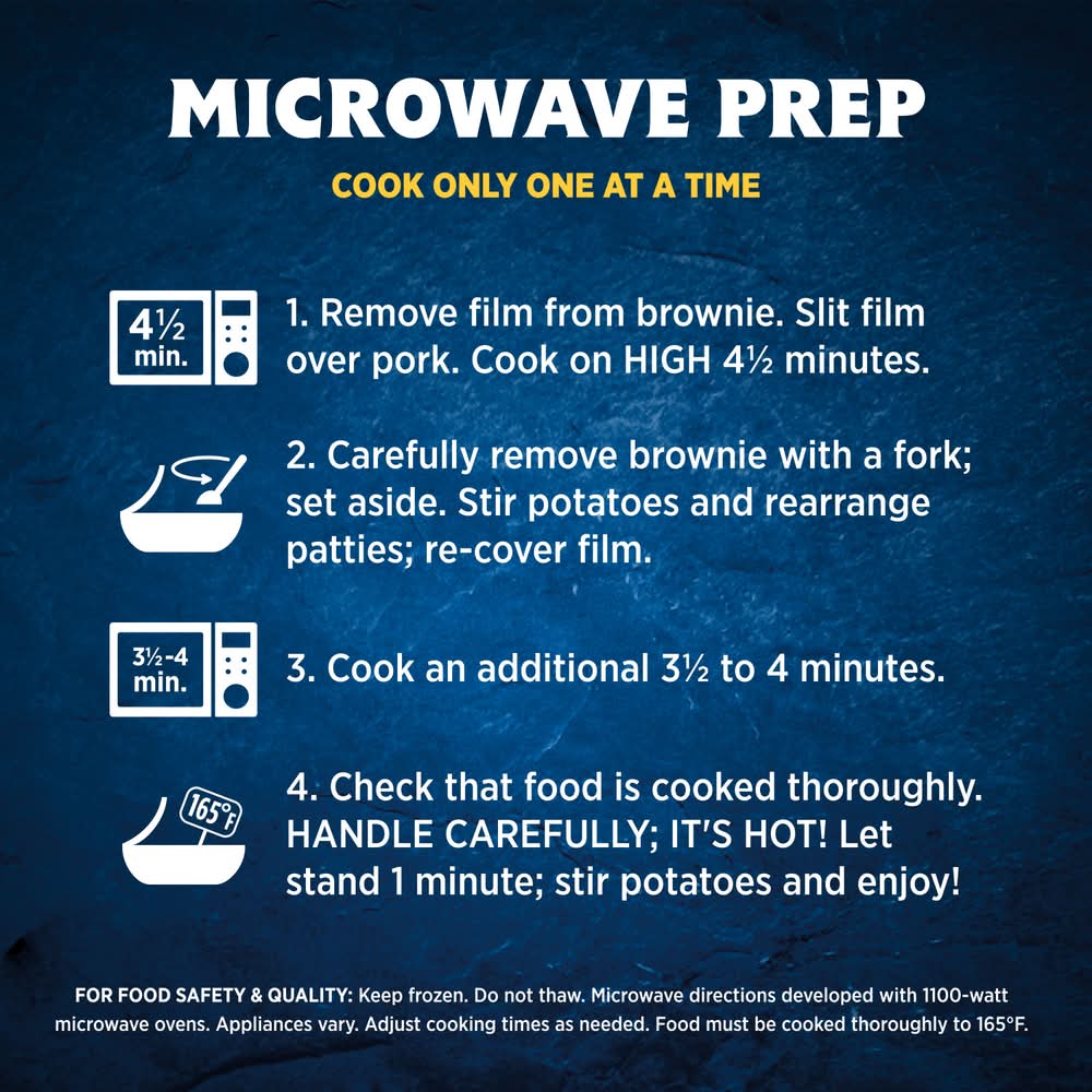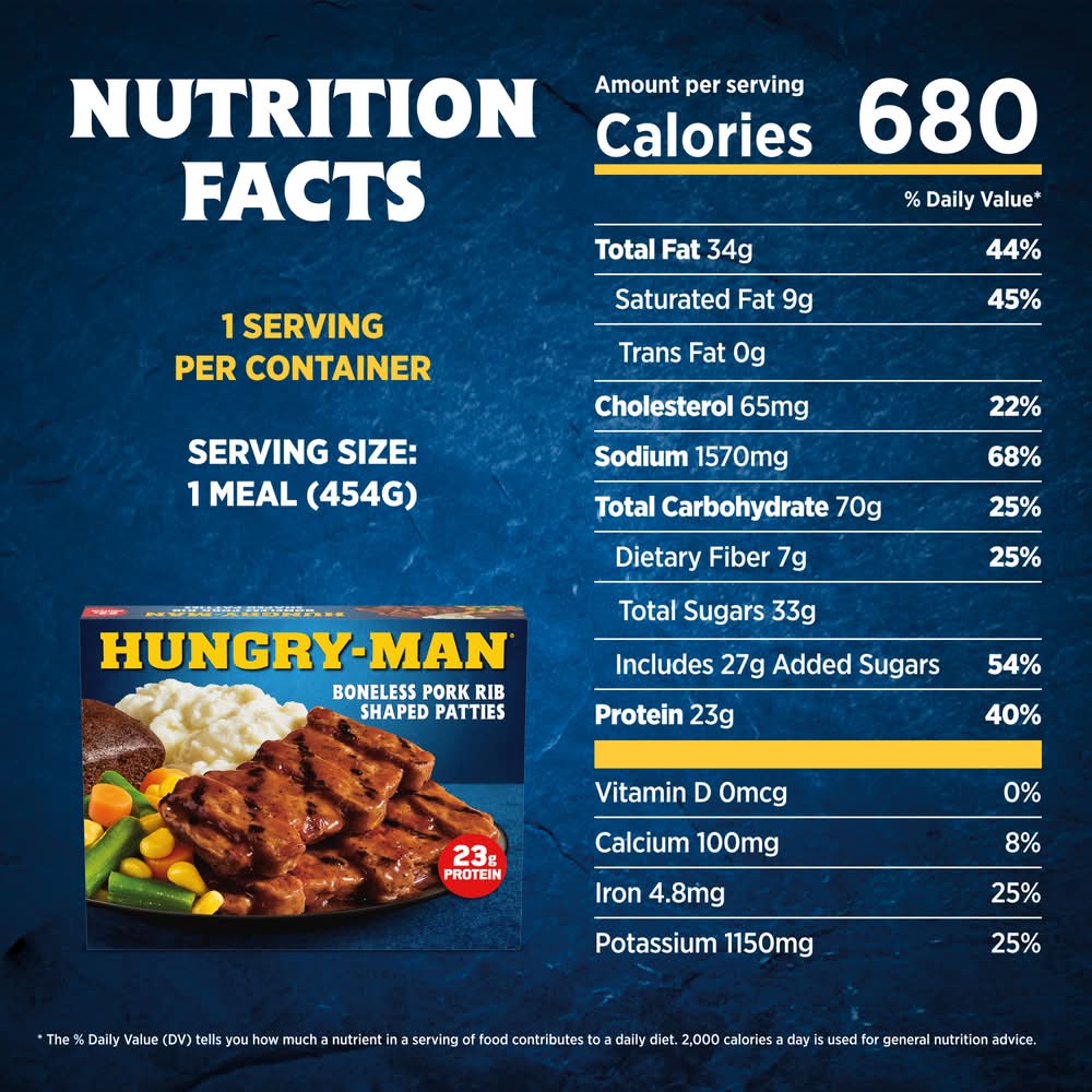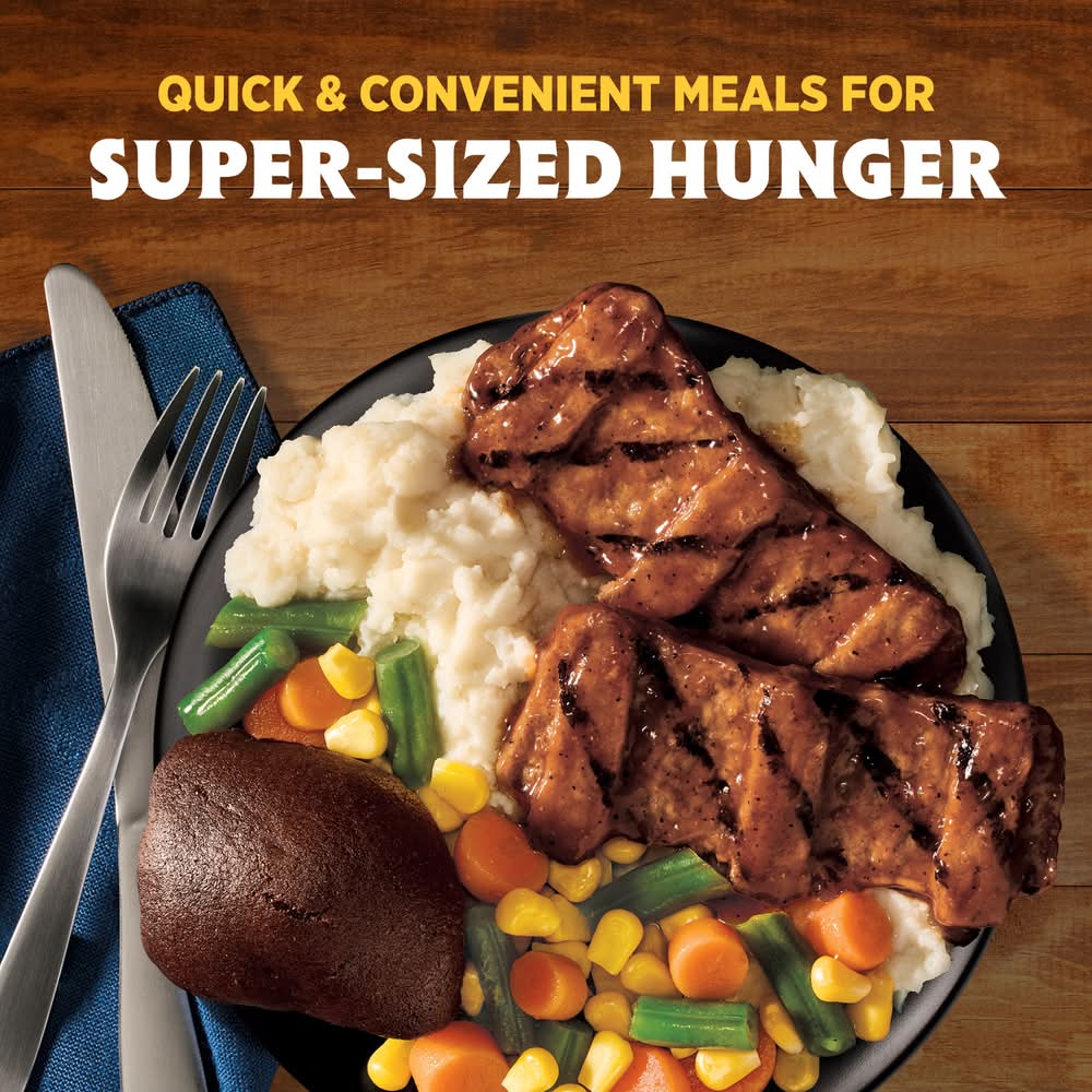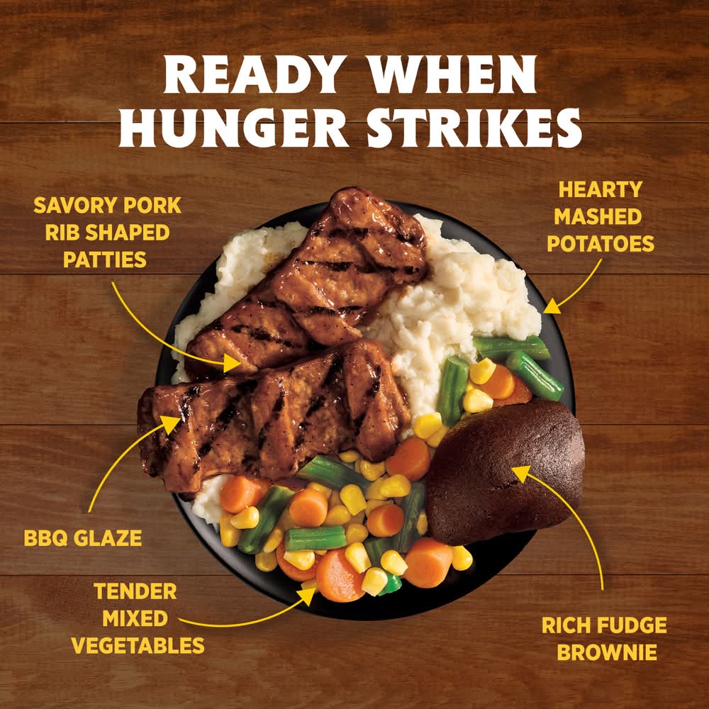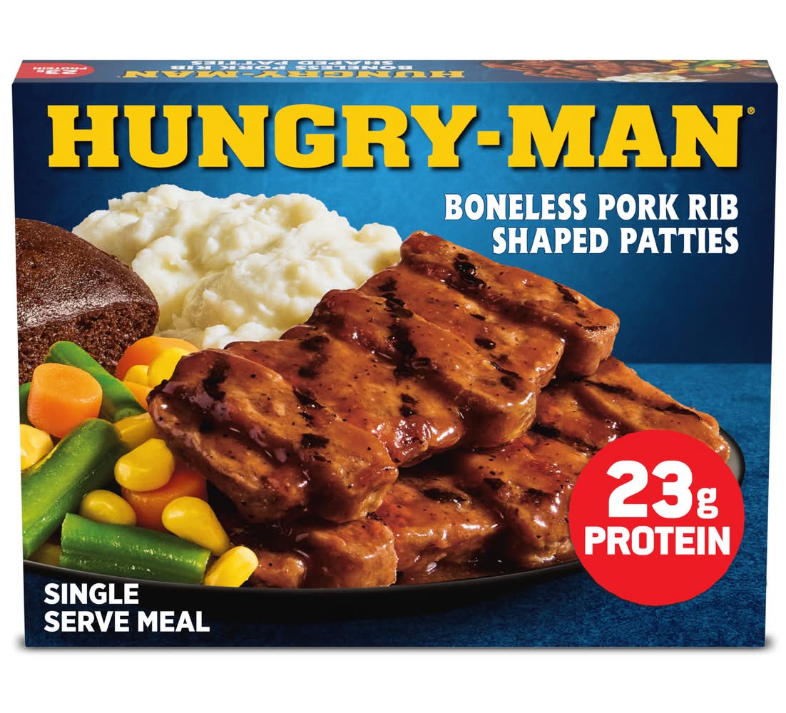 Enjoy classic home-style flavors and satisfy your comfort food cravings with Hungry-Man Boneless Rib Shaped Pork Patties. Dig into an easy-to-prepare frozen meal featuring tender rib-shaped pork patties glazed with barbeque sauce, savory mashed potatoes and crisp mixed vegetable side dishes, and a rich chocolate brownie dessert. With 23 grams of protein per serving, this frozen food offers a home-style recipe for satisfying frozen entrees that are ready to eat anytime hunger strikes. Whether you're looking for convenient lunches to bring to work, a hearty TV dinner or easy meals that are ready to eat in minutes, Hungry-Man microwave meals are a great choice to tackle those tummy rumbles. Simply follow the instructions on the package to microwave or prepare these quick meals in a conventional oven. Each package contains one full meal that is perfect for busy lifestyles and hearty appetites. Store the convenient frozen meals in your freezer until you're ready to enjoy. Try other Hungry-Man frozen meals to find your favorite. Hungry-Man offers big portions for big appetites.