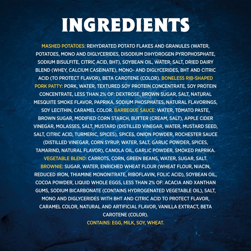 Ingredients: INGREDIENTS: MASHED POTATOES (WATER, DEHYDRATED POTATO FLAKES [POTATOES, MONO AND DIGLYCERIDES, SODIUM ACID PYROPHOSPHATE, CITRIC ACID], SEASONING SAUCE [SOYBEAN OIL, WATER, MONO AND DIGLYCERIDES WITH BHT AND CITRIC ACID TO PROTECT FLAVOR, BETA-CAROTENE FOR COLOR [CORN OIL, DL-ALPHA-TOCOPHEROL]), CONTAINS LESS THAN 2% OF: SALT, DRIED DAIRY BLEND [WHEY, CALCIUM CASEINATE], PORK RIB SHAPED PATTIES, PORK, WATER, SEASONING, TOMATO POWDER, DEXTROSE, BROWN SUGAR, VINEGAR POWDER [MALTODEXTRIN, MODIFIED FOOD STARCH, VINEGAR], SPICES, SUGAR, SPICE EXTRACTIVES [INCLUDING EXTRACTIVES OF CELERY SEED], ONION POWDER, CITRIC ACID, SALT, NATURAL SMOKE FLAVOR, GARLIC POWDER, HYDROLYZED SOY PROTEIN, NATURAL AND ARTIFICIAL FLAVOR, ISOLATED OAT PRODUCT, SOY PROTEIN CONCENTRATE, GLAZE SEASONING, FRUCTOSE, TOMATO POWDER, FOOD STARCH-MODIFIED, SALT, MALTODEXTRIN, SODIUM CITRATE, ONION POWDER, GREEN BELL PEPPER POWDER, VINEGAR SOLIDS, XANTHAN GUM, WORCESTERSHIRE SAUCE SOLIDS [MOLASSES, VINEGAR, CORN SYRUP, SALT, CARAMEL COLOR, GARLIC, SUGAR, SPICE, TAMARIND, NATURAL FLAVOR], GARLIC POWDER, SPICES, AUTOLYZED YEAST EXTRACT [CONTAINS DEXTROSE], NATURAL SMOKE FLAVOR [NATURAL FLAVOR WITH MALTODEXTRIN, CORN FLOUR, GRILL FLAVOR (FROM SOYBEAN OIL), SMOKE FLAVOR], SALT, SODIUM PHOSPHATE, ENRICHED WHEAT FLOUR, WHEAT FLOUR, NIACIN, REDUCED IRON, THIAMINE MONONITRATE, RIBOFLAVIN, FOLIC ACID, WHOLE EGGS, SPICE EXTRACT, BARBEQUE SAUCE (HIGH FRUCTOSE CORN SYRUP, WATER, TOMATO PASTE, CANE SYRUP, DISTILLED VINEGAR, MODIFIED CORN STARCH, SMOKE FLAVOR, SALT, CELLULOSE GEL, CELLULOSE GUM, POTASSIUM CHLORIDE, ONION POWDER, SPICE, GARLIC POWDER, XANTHAN AND GUAR GUMS, MUSTARD FLOUR, CARAMEL COLOR), MIXED VEGETABLES (CARROTS, CORN, CUT GREEN BEANS), BROWNIE (SUGAR, WATER, ENRICHED WHEAT FLOUR [WHEAT FLOUR, NIACIN, REDUCED IRON, THIAMINE MONONITRATE, RIBOFLAVIN, FOLIC ACID], SOYBEAN OIL, COCOA, WHOLE EGGS, SEASONING SAUCE [SOYBEAN OIL, WATER, MONO AND DIGLYCERIDES WITH BHT AND CITRIC ACID TO PROTECT FLAVOR, BETA-CAROTENE FOR COLOR [CORN OIL, DL-ALPHA-TOCOPHEROL]), ACACIA AND XANTHAN GUMS, SODIUM BICARBONATE [HYDROGENATED VEGETABLE OIL], SALT, NATURAL AND ARTIFICIAL FLAVOR [NATURAL AND ARTIFICIAL FLAVOR, CARAMEL COLOR, VANILLA EXTRACTIVES], SEASONING SAUCE, WATER, SUGAR, SEASONING SAUCE [SOYBEAN OIL, WATER, MONO AND DIGLYCERIDES WITH BHT AND CITRIC ACID TO PROTECT FLAVOR, BETA-CAROTENE FOR COLOR (CORN OIL, DL-ALPHA-TOCOPHEROL)], SALT, SOYBEAN OIL, . Contains: SOY, WHEAT, EGGS, MILK