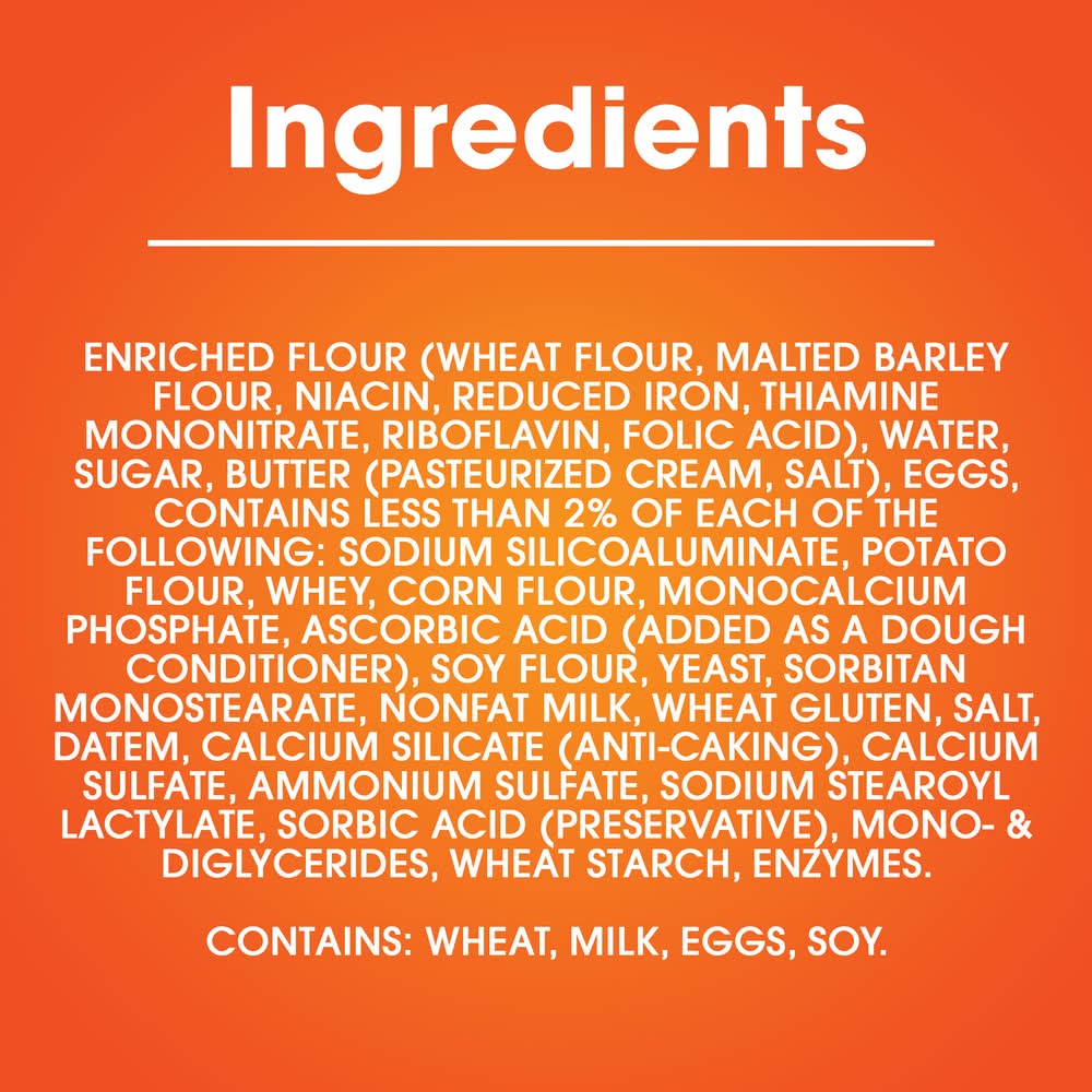 Ingredients: Enriched Flour Wheat Flour, Malted Barley Flour, Niacin, Reduced Iron, Thiamine Mononitrate, Riboflavin, Folic Acid, Water, Sugar, Butter Pasteurized Cream, Salt, Eggs, Contains Less than 2% of Each of the Following: Sodium Silicoaluminate, Potato Flour, Whey, Corn Flour, Monocalcium Phosphate, Ascorbic Acid Added as a Dough Conditioner, Soy Flour, Yeast, Sorbitan Monostearate, Nonfat Milk, Wheat Gluten, Salt, DATEM, Calcium Silicate Anti-Caking, Calcium Sulfate, Ammonium Sulfate, Sodium Stearoyl Lactylate, Sorbic Acid Preservative, Mono- & Diglycerides, Wheat Starch, Enzymes. Contains: wheat, milk, eggs, soybeans, Barley, Gluten, corn