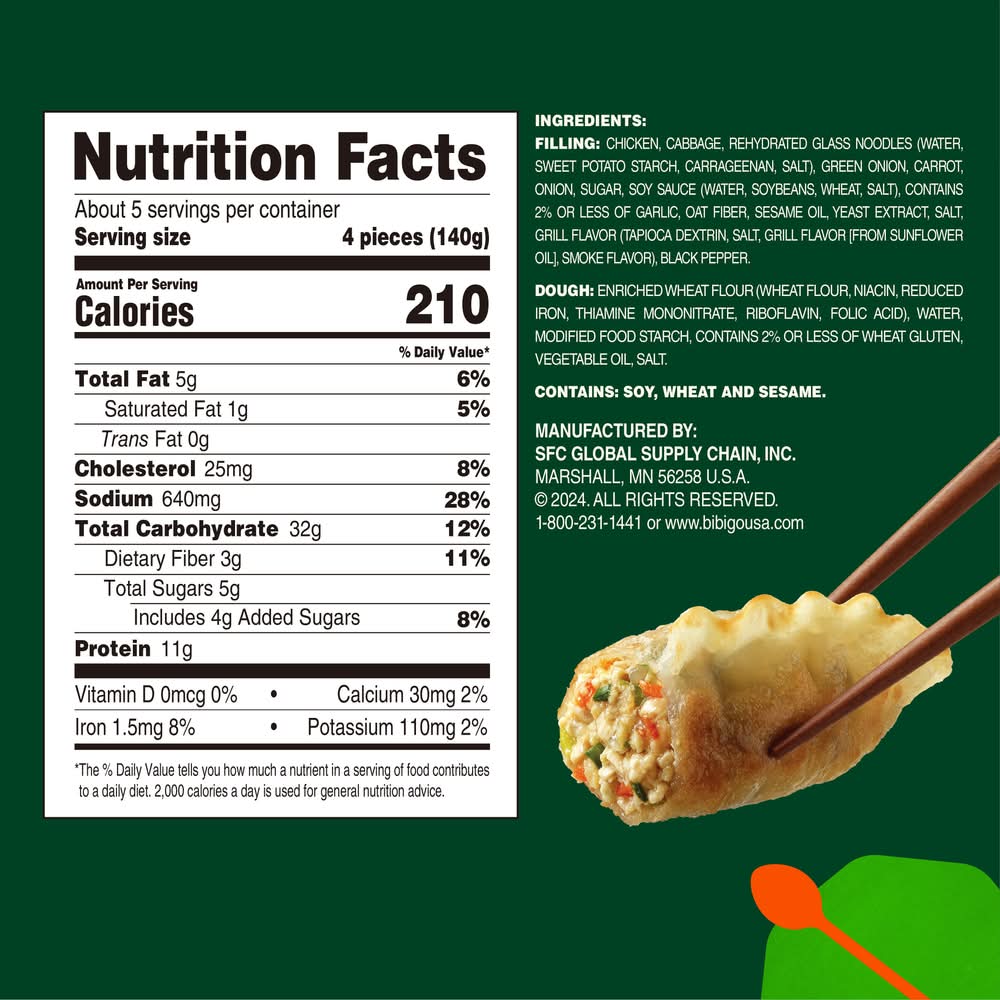 Ingredients: Filling: Chicken, Cabbage, Rehydrated Glass Noodles (Water, Sweet Potato Starch, Carrageenan, Salt), Green Onion, Carrot, Onion, Sugar, Soy Sauce (Water, Soybeans, Wheat, Salt), Contains 2% or Less of Garlic, Oat Fiber, Sesame Oil, Yeast Extract, Salt, Grill Flavor (Tapioca Dextrin, Salt, Grill Flavor [from Sunflower Oil], Smoke Flavor), Black Pepper. Dough: Enriched Wheat Flour (Wheat Flour, Niacin, Reduced Iron, Thiamine Mononitrate, Riboflavin, Folic Acid), Water, Modified Food Starch, Contains 2% or Less of Wheat Gluten, Vegetable Oil, Salt Contains: Wheat, Soy, Sesame