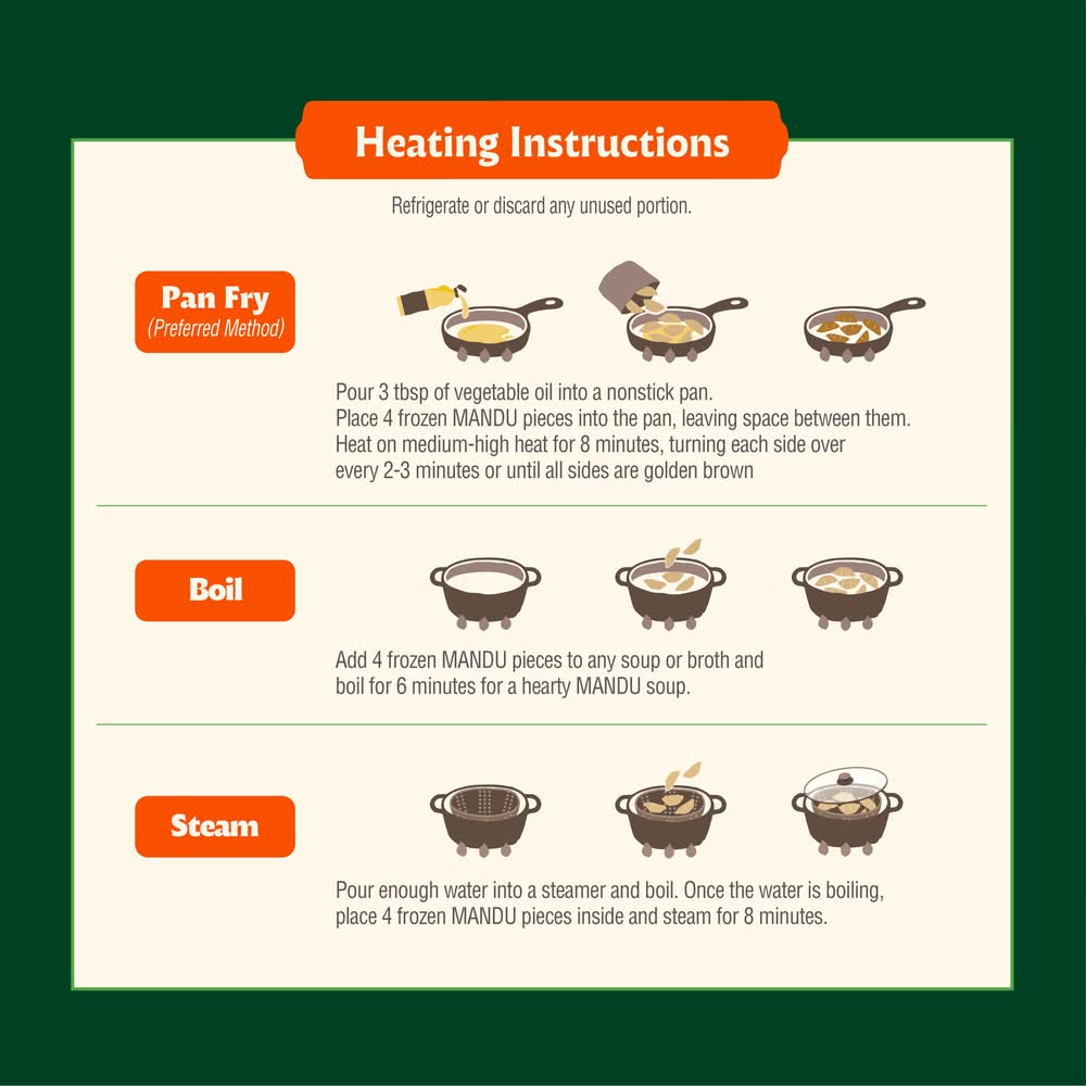 Directions for use: Heating Instructions: Pan Fry: Pour 3 tbsp of vegetable oil into a nonstick pan. Place 4 frozen Mandu pieces into the pan, leaving space between them. Heat on medium-high for 8 minutes, turning each side over every 2-3 minutes or until all sides are golden brown. Boil: Add 4 frozen Mandu pieces to any soup or broth and boil for 6 minutes for a hearty Mandu soup. Steam: Pour enough water into a steamer and boil. Once the water is boiling, place 4 frozen Mandu pieces inside and steam for 8 minutes. Keep frozen. Tear here to open. Storage recommendation: Keep frozen.
