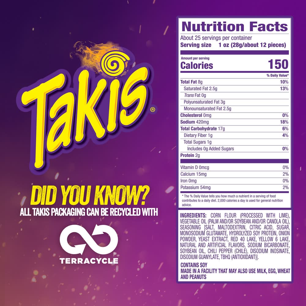 Tired of bland and boring snacks, tasteless tortilla chips, flavorless pretzels, or the same old potato chips? Change the way you munch with Takis Rolled Corn Tortilla Chips and give your taste buds the treat of deliciously intense flavor. We know the urge for a flavor-packed snack can strike at any time, leaving you in a less-than-stellar mood and putting a damper on your otherwise fantastic day. This is why we paved the way with these uniquely shaped chips that unleash tantalizing waves of flavor and fire up your tastebuds with every bite. Pack a bag to give yourself a tasty pick-me-up at school, be ready to munch away while spending the day hanging with your friends, or grab a handful for when you need a boost of flavor while hunting for new adventures. Not only are Takis rolled corn tortilla chips the ultimate snack, but they are also a great food for sharing with friends and family. Share a snack with your squad and transform a low-key hangout into a delicious celebration, or turn the vibes up to ten on your next road trip. • Flavor: Hot chili pepper-lime • Number of servings: 25