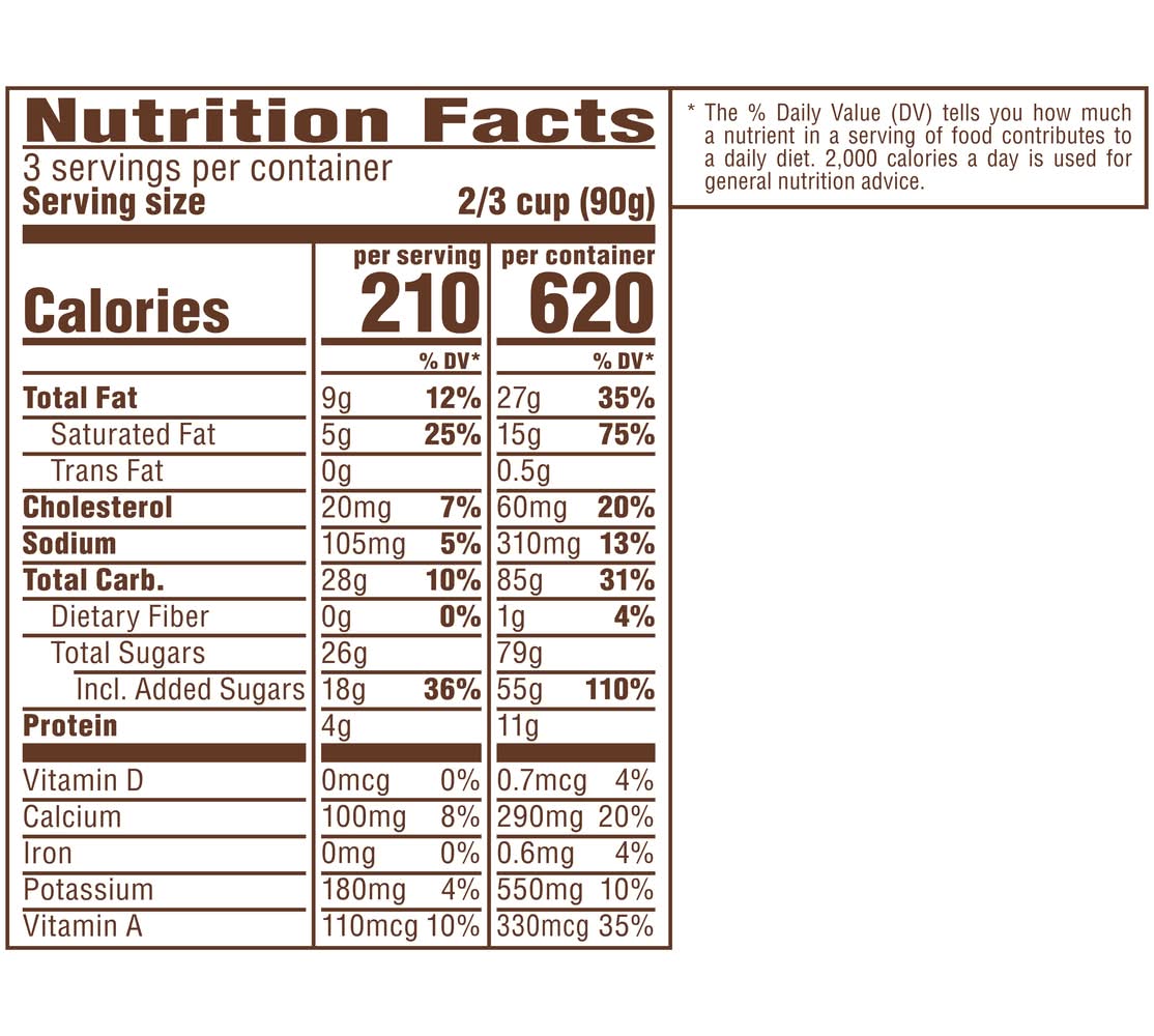 Vanilla flavored reduced fat ice cream with artificial flavor added with Snickers Bar Pieces, a caramel swirl and chocolatey peanuts. Per Serving: 210 calories; 5 g sat fat (25% DV); 105 mg sodium (5% DV); 26 g total sugars. 3 servings per container. Reduced fat. 45% less fat than a range of full-fat ice creams. See nutrition information for saturated fat content. This product contains 8 g of fat per 2/3 cup serving. A range of full-fat ice creams has an average of 17 g of fat per 2/3 cup serving. • Flavor: Vainilla • Mars Wrigley Confectionery Us, Llc, Hackettstown, NJ, 07840-1503 • Packaging: Reusable