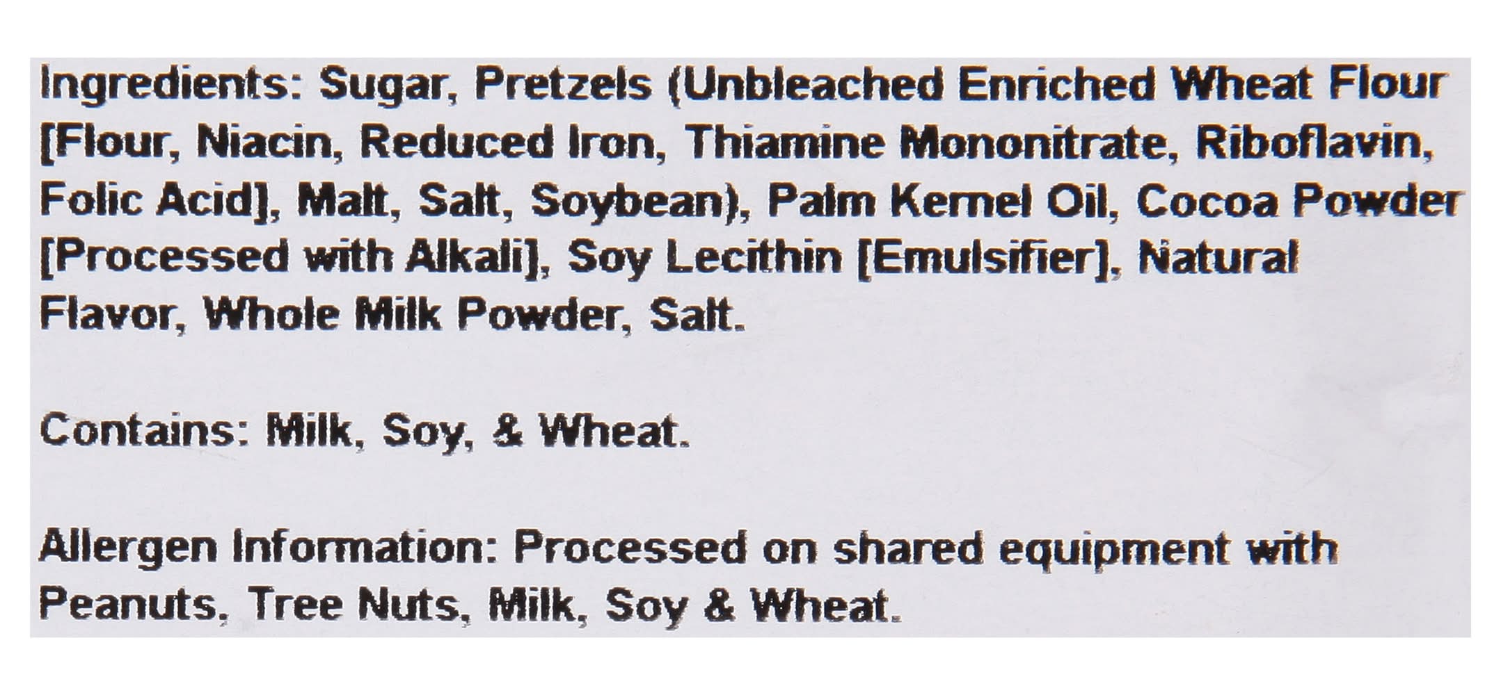 Ingredients: Sugar, Pretzels (Unbleached Enriched Wheat Flour [Flour, Niacin, Reduced Iron, Thiamine Mononitrate, Riboflavin, Folic Acid], Malt, Salt, Soybean), Palm Kernel Oil, Cocoa Powder [Processed with Alkali), Soy Lecithin [Emulsifier], Natural Flavor, Whole Milk Powder, Salt Contains: Milk, Soybeans, Wheat, Peanuts, Tree Nuts, Milk, Soybeans, Wheat
