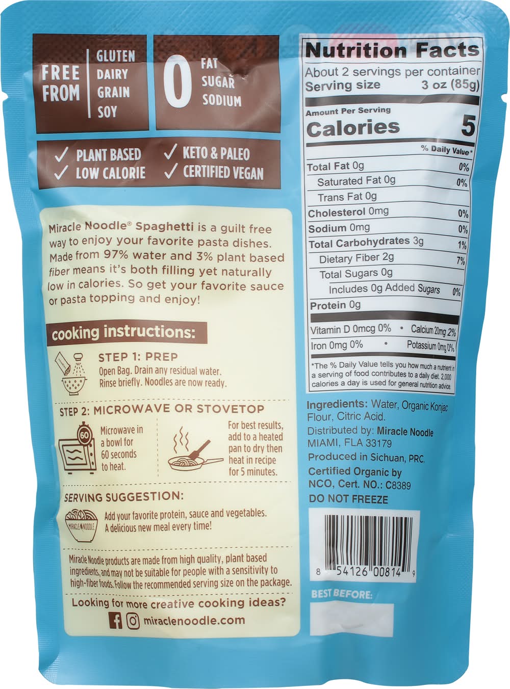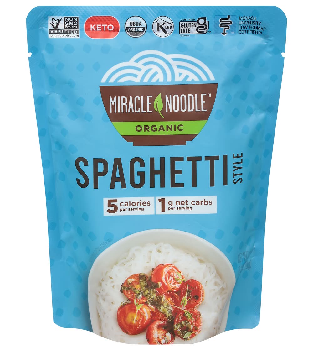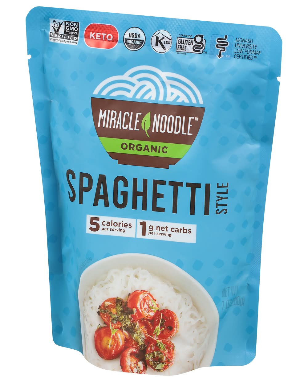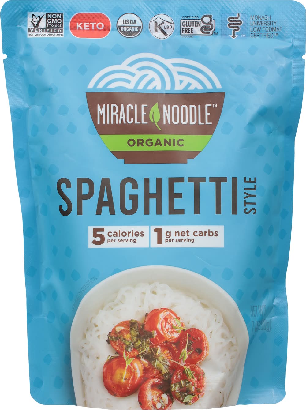Noodle, Organic, Spaghetti Style • Brand: Miracle noodle • kosher, gluten-free, organic, vegan, low calorie, GMO-free • Number of servings: 2