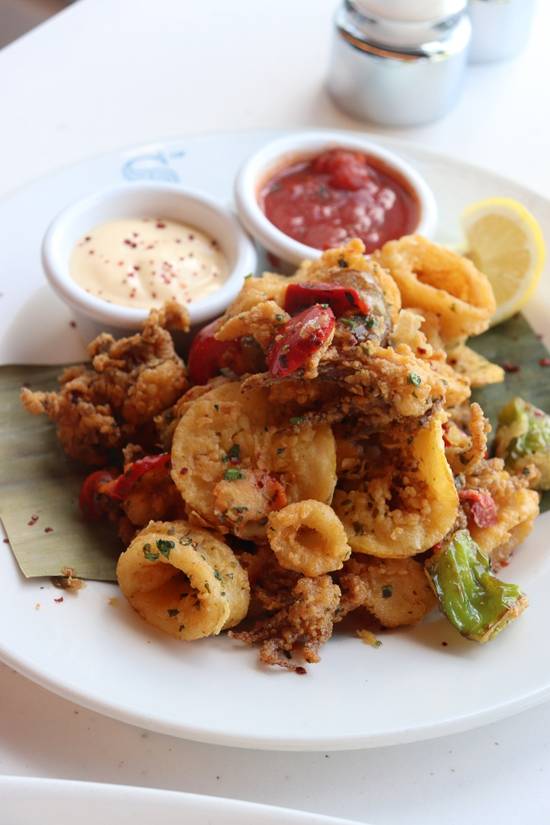crispy Point Judith calamari with shishito, cherry peppers, lemon aioli, marinara