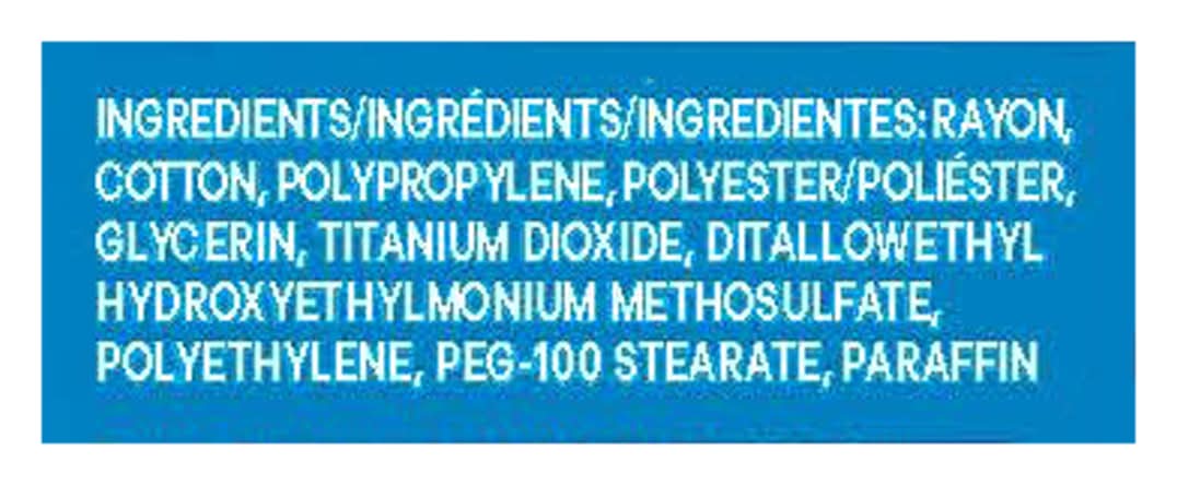 Ingredients: Ingredients (May Contain): Cotton, Rayon, Polyester, Polypropylene, Polyethylene, Fiber Finishes. Contains: Cotton