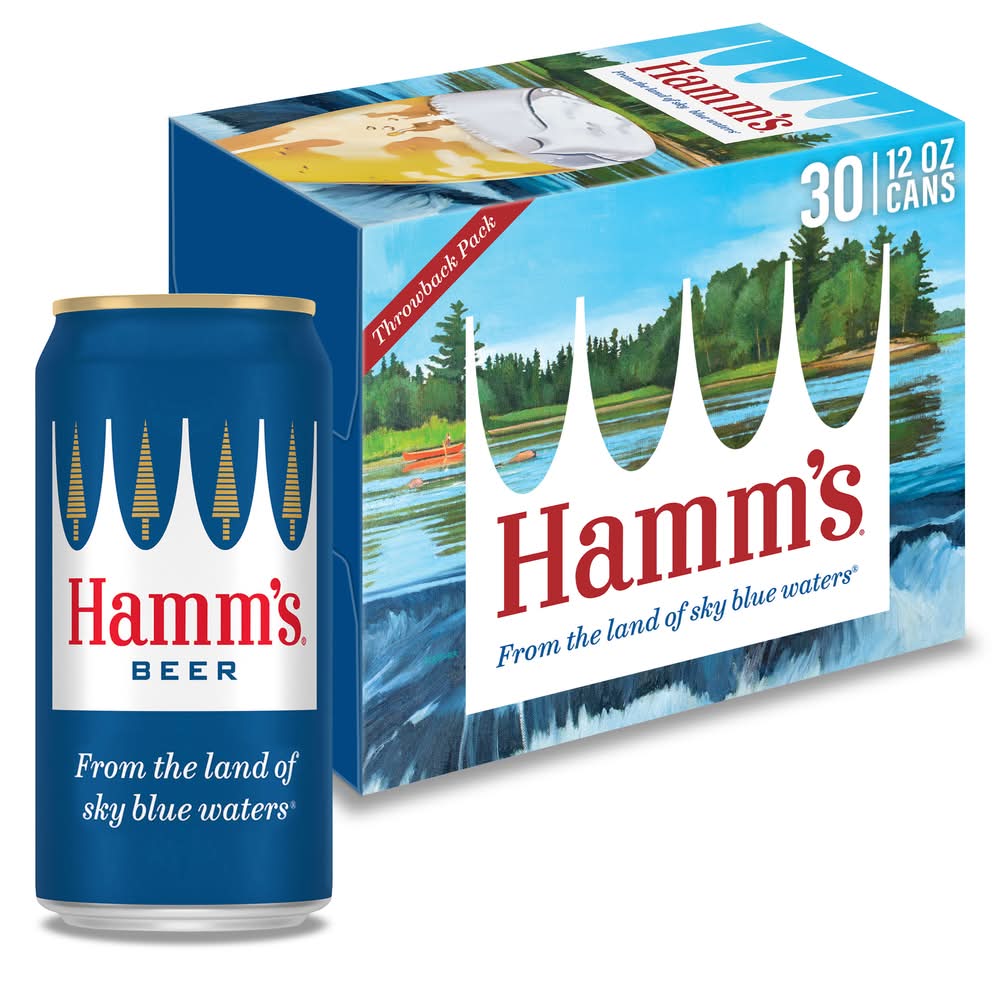 Born in the land of sky blue waters. Brewed in true family tradition from purest water and choicest barley malt, grains and hops. It's extremely balanced taste is sparkling and refreshing, with a hin Founded in St Paul Minnesota in 1865, Hamm’s beer was a top 10 beer brand in the 1960s and remains authentic to its original heritage, in fact, the cans have looked the same for 40 years. A classic American lager beer, Hamm's pairs well with a wide range of deliciously unpretentious comfort foods fried apps, mild cheeses and shellfish especially. Plus, we all know Hamm’s beer is a brats’ best friend. • Brand: Hamm's • Category: American-style lager • Pack size: 30 • Alcohol by volume: 4.7%